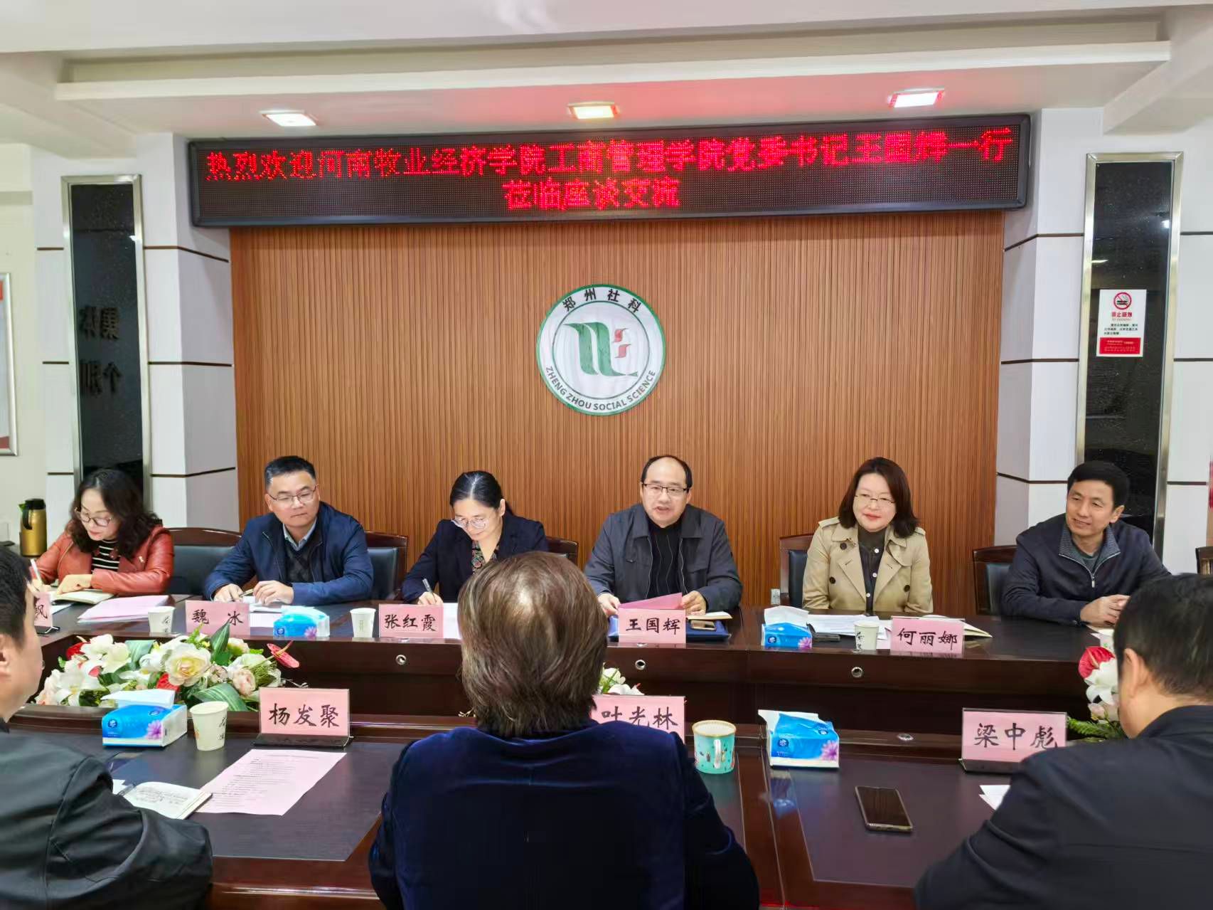 2025年10月13日上午,ok138cn太阳集团古天乐赴郑州市社科联进行调研,双方围绕科研协同攻关、智库平台共建、学术资源互通、决策咨询合作等进行了深入交流。郑州市社科联党组书记、主席叶光林,党组成员、一级调研员梁中彪,以及学会部、经济所等部门负责人出席;ok138cn太阳集团科学技术处副处长张红霞、ok138cn太阳集团古天乐党委书记王国辉、副院长(主持工作)何丽娜、陈先锋等学院领导与科研骨干共同参会。会议由郑州市社科联党组成员、一级调研员梁中彪主持。