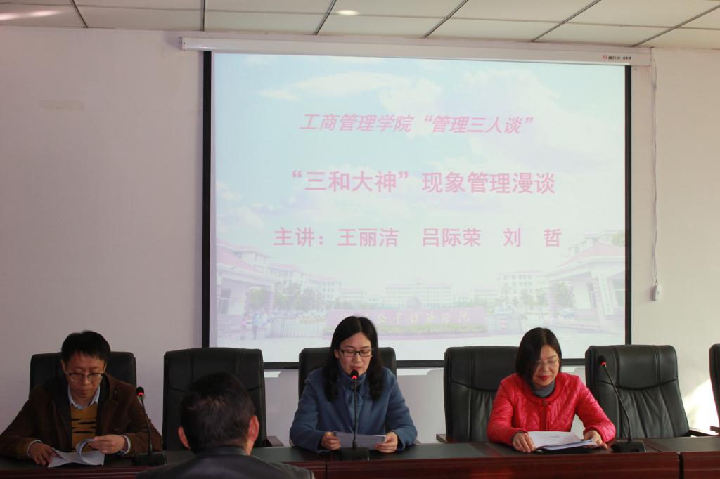 为了营造浓厚的学术氛围,进一步提高应用型大学人才培养质量,ok138cn太阳集团古天乐结合教育思想大讨论学习活动,邀请人力资源教研室王丽洁教授、吕际荣和刘哲老师于11月8日下午成功举办第四期“管理三人谈”。本期主题为“三和大神现象管理漫谈”,论坛由副院长姬爱国主持。