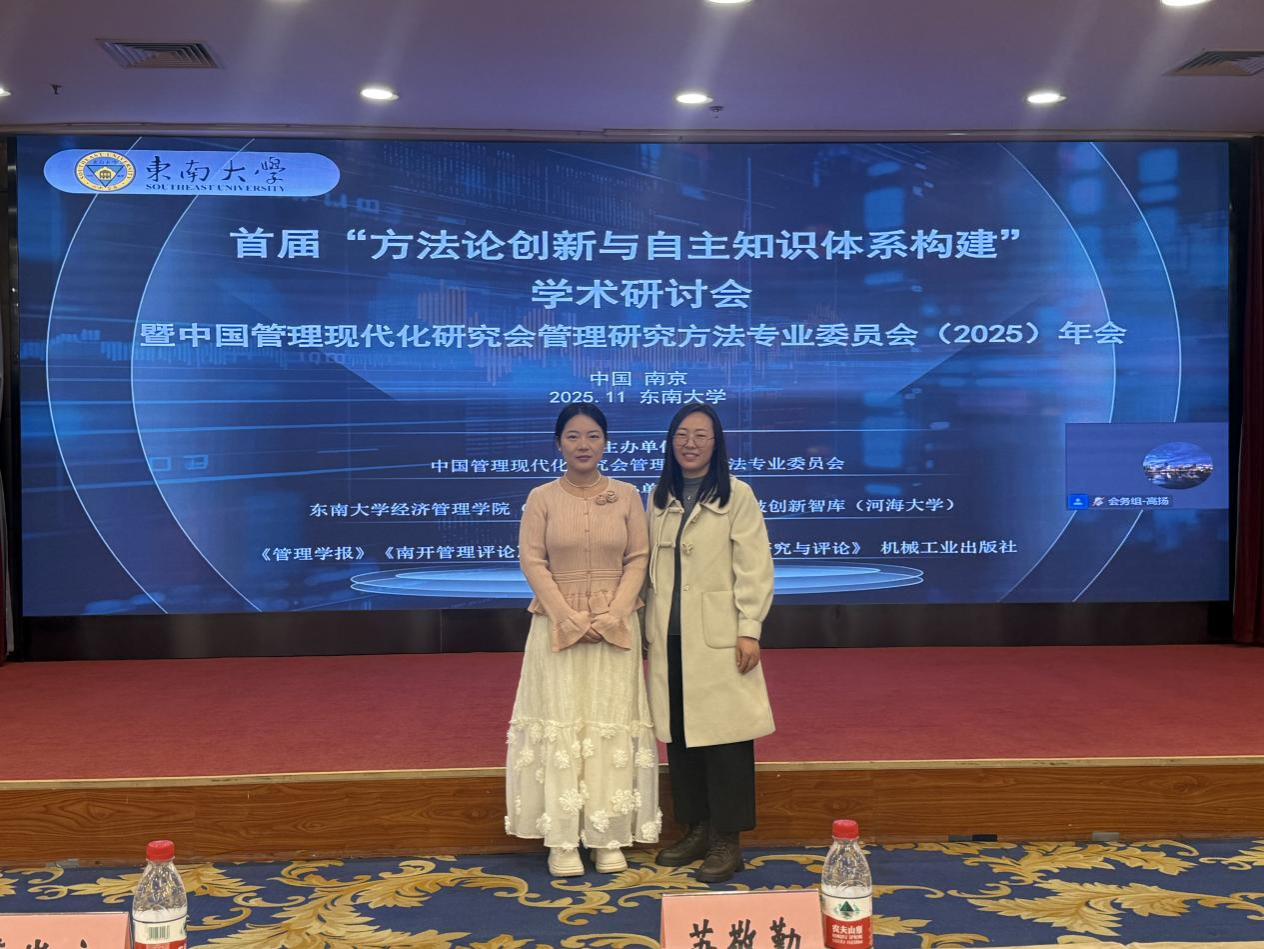 20251107日至09日,首届“方法论创新与自主知识体系构建”学术研讨会暨中国管理现代化研究会管理研究方法专业委员会(2025)年会在南京东南大学隆重召开。本次会议由中国管理现代化研究会管理研究方法专业委员会主办,东南大学经济管理学院承办,来自全国多所高校及研究机构的专家学者齐聚一堂,围绕方法论创新与中国自主知识体系构建展开深入研讨。我院白培培博士、滕海丽博士两位老师参加了本次研讨会。