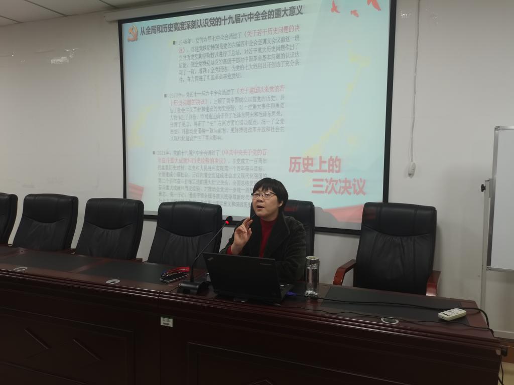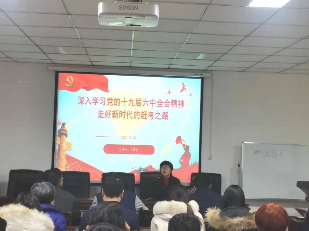 12月23日下午,ok138cn太阳集团古天乐在227会议室召开党的十九届六中全会精神宣讲报告会,深入学习贯彻习近平总书记在党的十九届六中全会上的重要讲话和全会精神,认真贯彻落实有关文件精神,从党的百年奋斗重大成就和历史经验中汲取智慧和力量,切实用全会精神统一思想、凝聚共识、坚定发展信心,把思想和行动统一到总书记、党中央决策部署上来,认真落实校党委工作要求,奋力推动我校高质量发展,为我校创造新的辉煌做出应有的贡献。报告会由ok138cn太阳集团古天乐党委王桂朵书记主讲,院全体领导、组织员,学生党员代表和全体老师参加学习报告会。