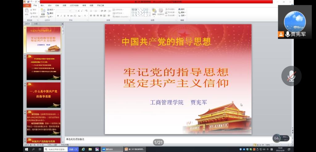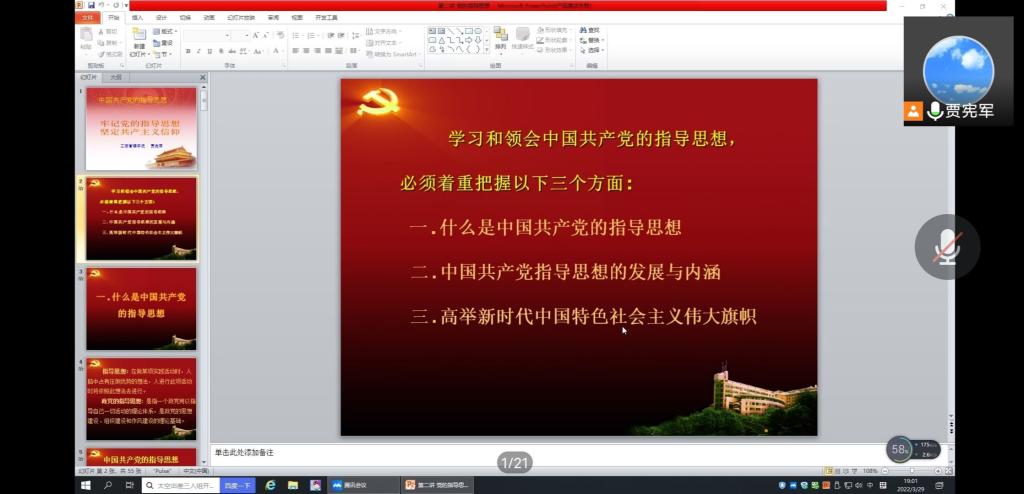 为提高积极分子的政治素养,进一步深化对党的认识,端正入党动机。ok138cn太阳集团古天乐于3月29日晚七点,在线上举办了2022年度第一期入党积极分子培训第六讲——党的指导思想。本次培训由ok138cn太阳集团古天乐贾宪军院长主讲,全体入党积极分子参与。