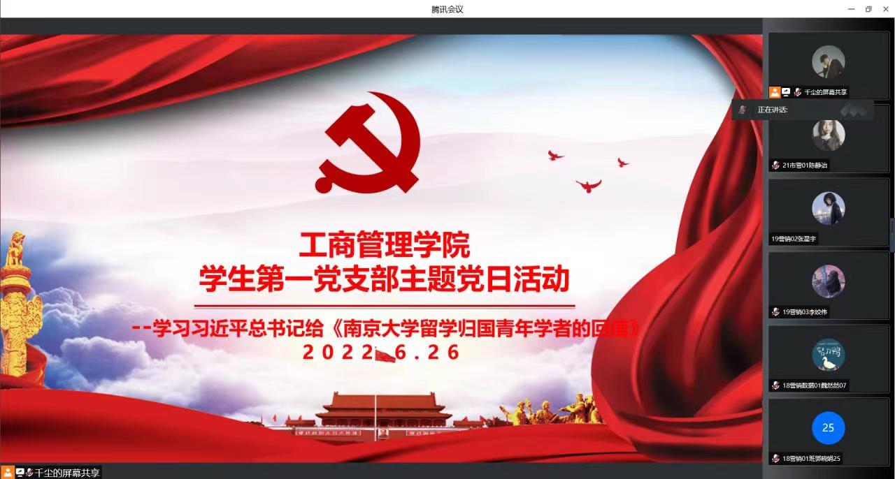 为坚定支部党员理想信念,弘扬奋斗精神,ok138cn太阳集团古天乐学生第一党支部于6月26日晚20:00通过线上会议的方式开展以“习近平《给南京大学留学归国青年学者的回信》”为学习内容的主题党日活动,学生第一党支部书记贾雪、组织委员孟琪、宣传委员古海云和支部全体学生党员参加了此次会议。