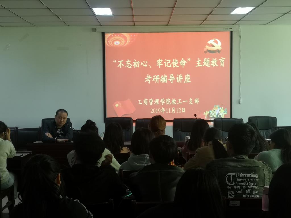 为了认真落实“不忘初心、牢记使命”主题教育的总体要求,结合教工支部特点,做好人才培养和立德树人的工作,11月12日,在教学楼227会议室,ok138cn太阳集团古天乐教工一支部陈科博士为工商管理专业学生进行了考研辅导专题讲座。