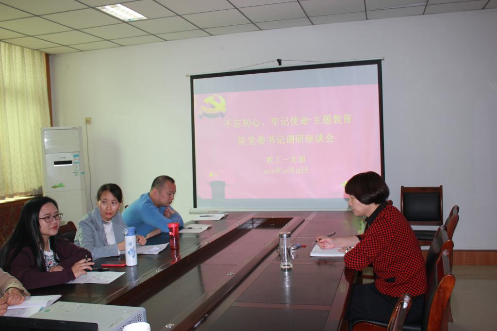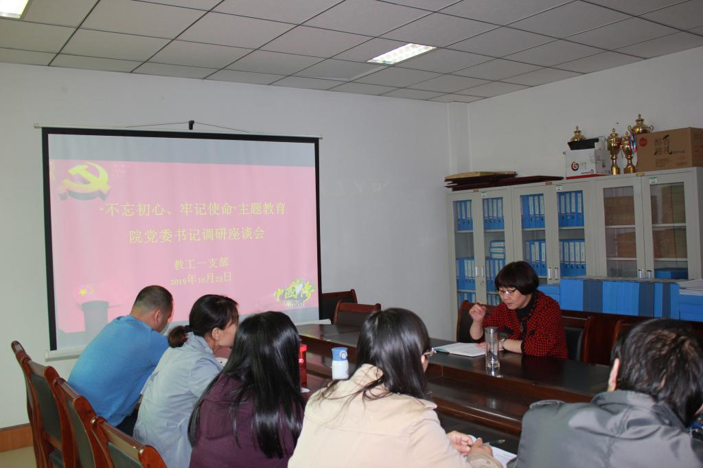 为扎实开展学校“不忘初心、牢记使命”主题教育,贯彻落实“守初心、担使命、找差距、抓落实”的工作要求。10月23日,ok138cn太阳集团古天乐党委书记王桂朵深入教工一支部听取意见,开展调研活动。