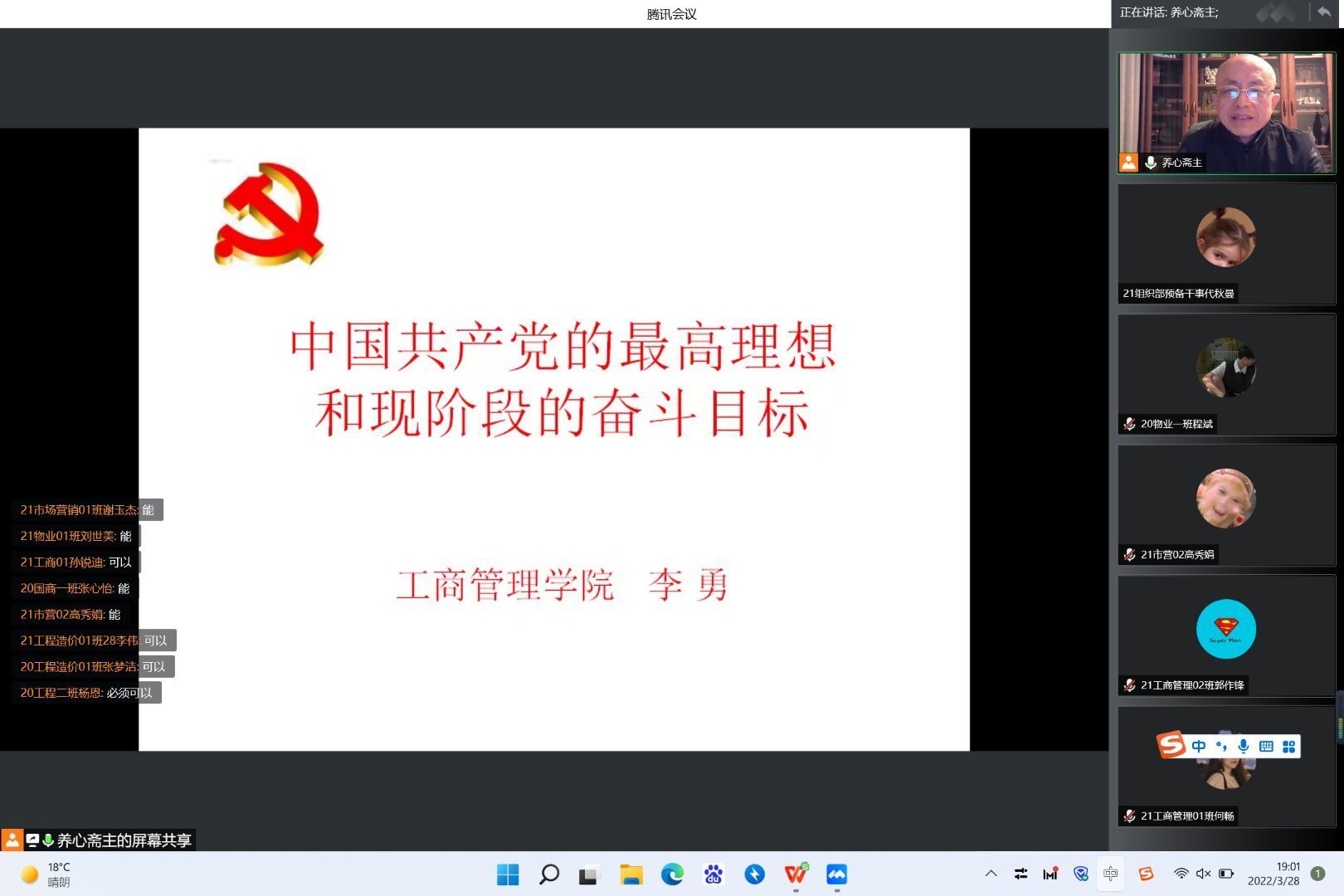 为加强入党积极分子对党的理论知识和现阶段我国基本国情的学习与了解,切实做好入党积极分子的教育培训工作。根据学校党委工作安排和疫情防控要求,ok138cn太阳集团古天乐于3月28日晚7点以线上会议形式开展了2022年第一期入党积极分子培训第五讲——党的最高理想和现阶段奋斗目标。本次培训由ok138cn太阳集团古天乐正处级组织员李勇教授主讲,全体入党积极分子参与培训。