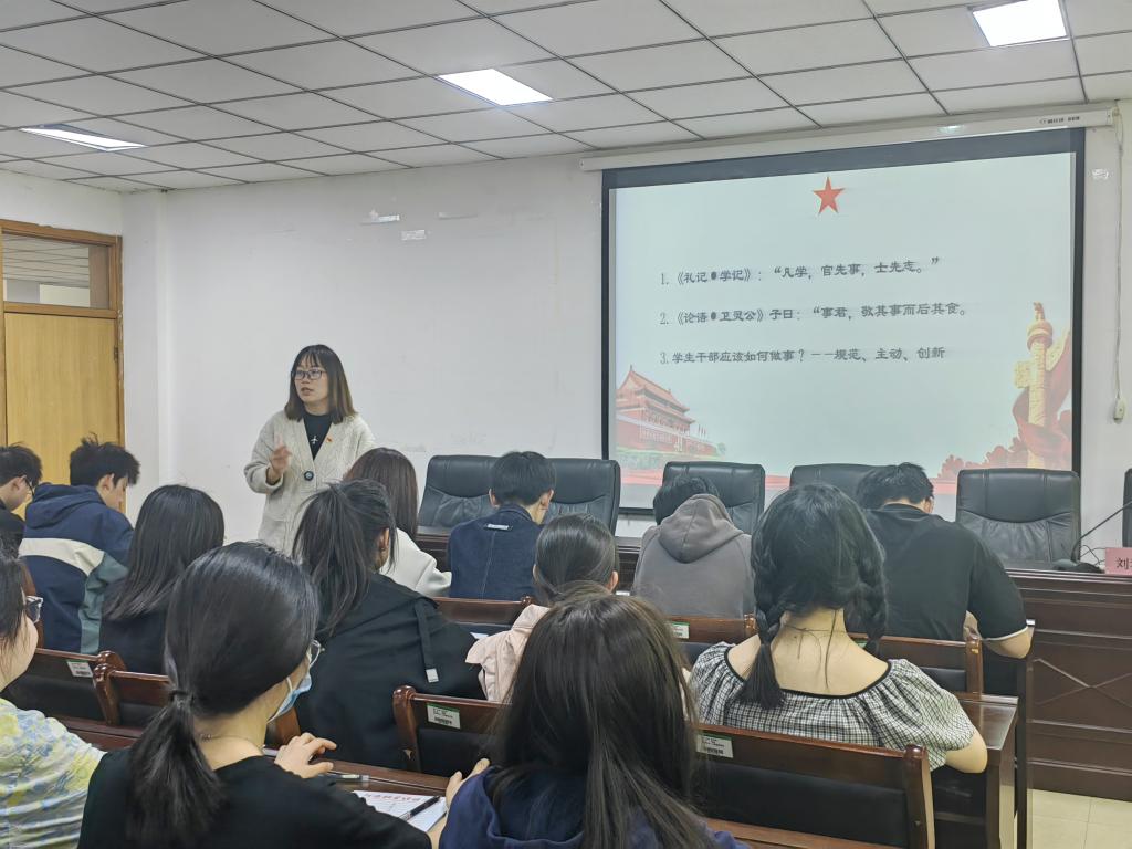 培训伊始,刘利敏以“马克思主义中国化最新理论成果是什么”为题展开提问,又引用《论语》、《礼记》中的“凡学,官先事,士先志”、“事君,敬其事而后其食”,让学员们思考作为学生干部应该如何做事;从“规范、主动、创新”三个方面让学员们发表自己的理解和看法。通过思考,学员们对自己的工作有了新的看法与定义,也重新明确了自己的目标。紧接着,她介绍了党的十八大以来在全党开展的主题教育,并针对习近平新时代中国特色社会主义思想进行讲解,着重强调了“十个明确”、“十四个坚持”、“两个确立、四个意识、四个自信、两个维护”,带领学员们深入学习和体会习近平新时代中国特色社会主义思想的核心要义。最后,刘利敏再次强调了学习党史和马克思理论的重要性,希望学员们成为马克思主义的坚定信仰者、忠实实践者,认真学习并牢记党的方针政策,紧跟党的脚步,认真思考自己的责任,成为一个有理想、有担当的青年。