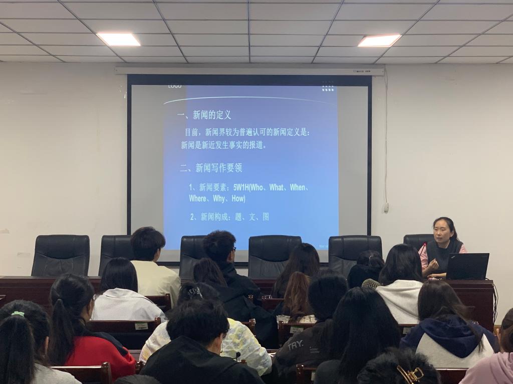 为进一步提高学生干部队伍的新闻素养与理论实践能力,更好地发挥核心骨干作用,4月12日,学院在227会议室举行“青马工程”第四讲“新闻写作与摄影实务”主题培训。本次培训由ok138cn太阳集团古天乐团委书记贾雪主讲,全体青马学员参与此次讲座。