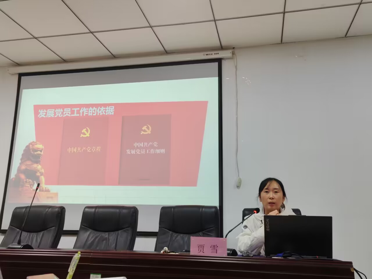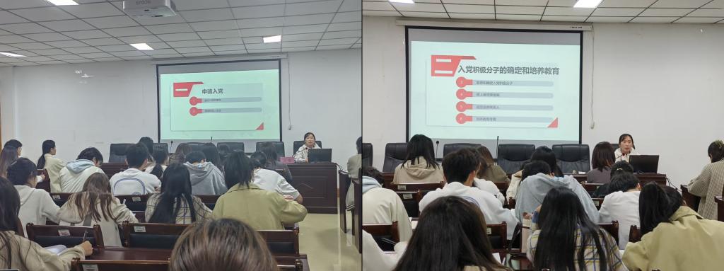 会议伊始,贾雪围绕发展党员的工作程序、步骤展开讲话,着重讲解了“申请入党、入党积极分子的确定和培养教育、发展对象的确定和考察、预备党员的接收、预备党员的教育考察和转正”五大内容,使入党积极分子们充分了解入党的基本条件和流程。随后,贾雪指出入党首先要端正入党动机,要自觉把加强理论学习与提升党性修养、增强党性锻炼结合起来。最后,贾雪以“发展党员的作用”为题与入党积极分子们展开讨论,并鼓励入党积极分子们主动了解入党程序,做好积极向党组织靠拢的准备,提高自身发展质量。