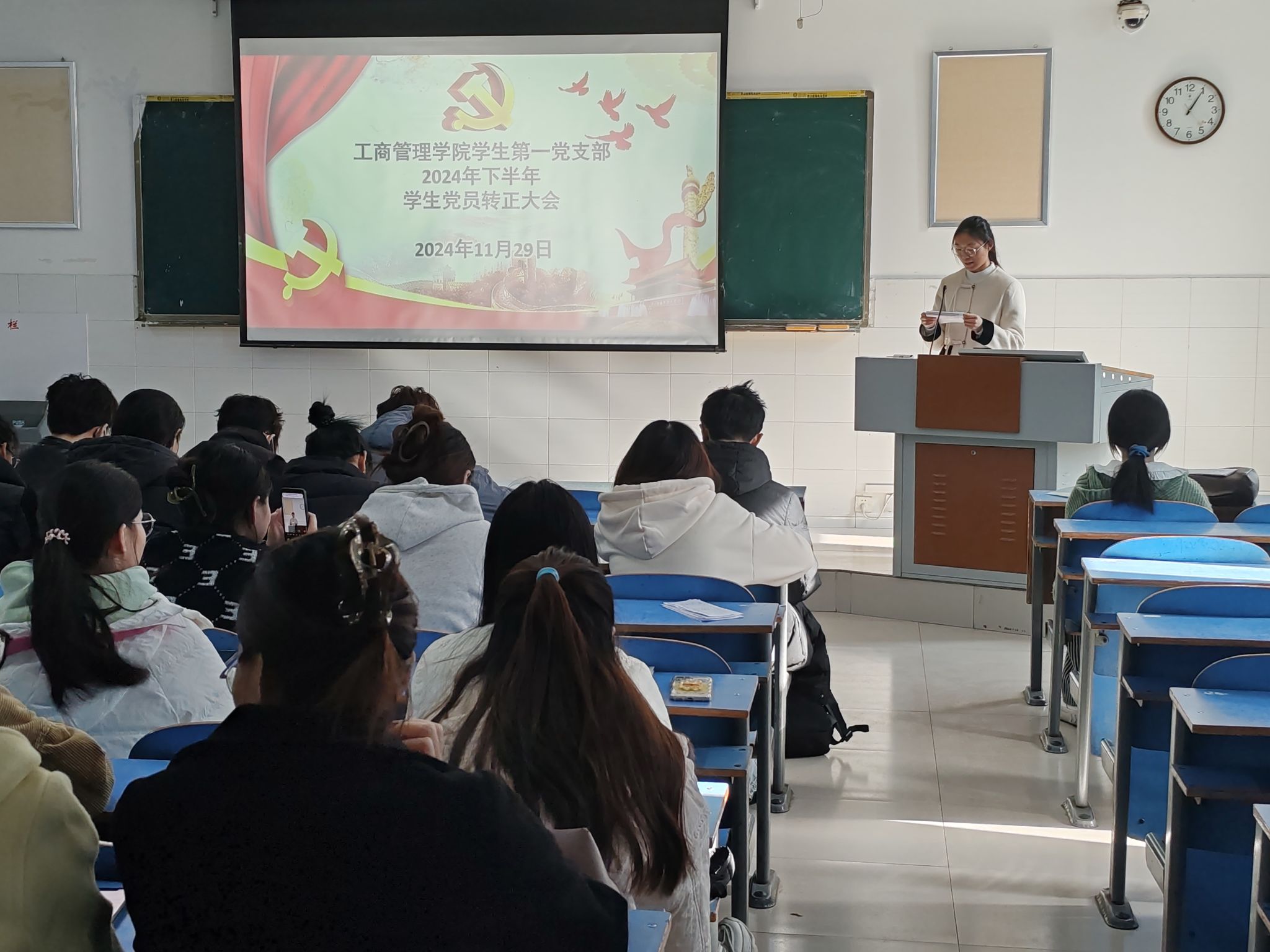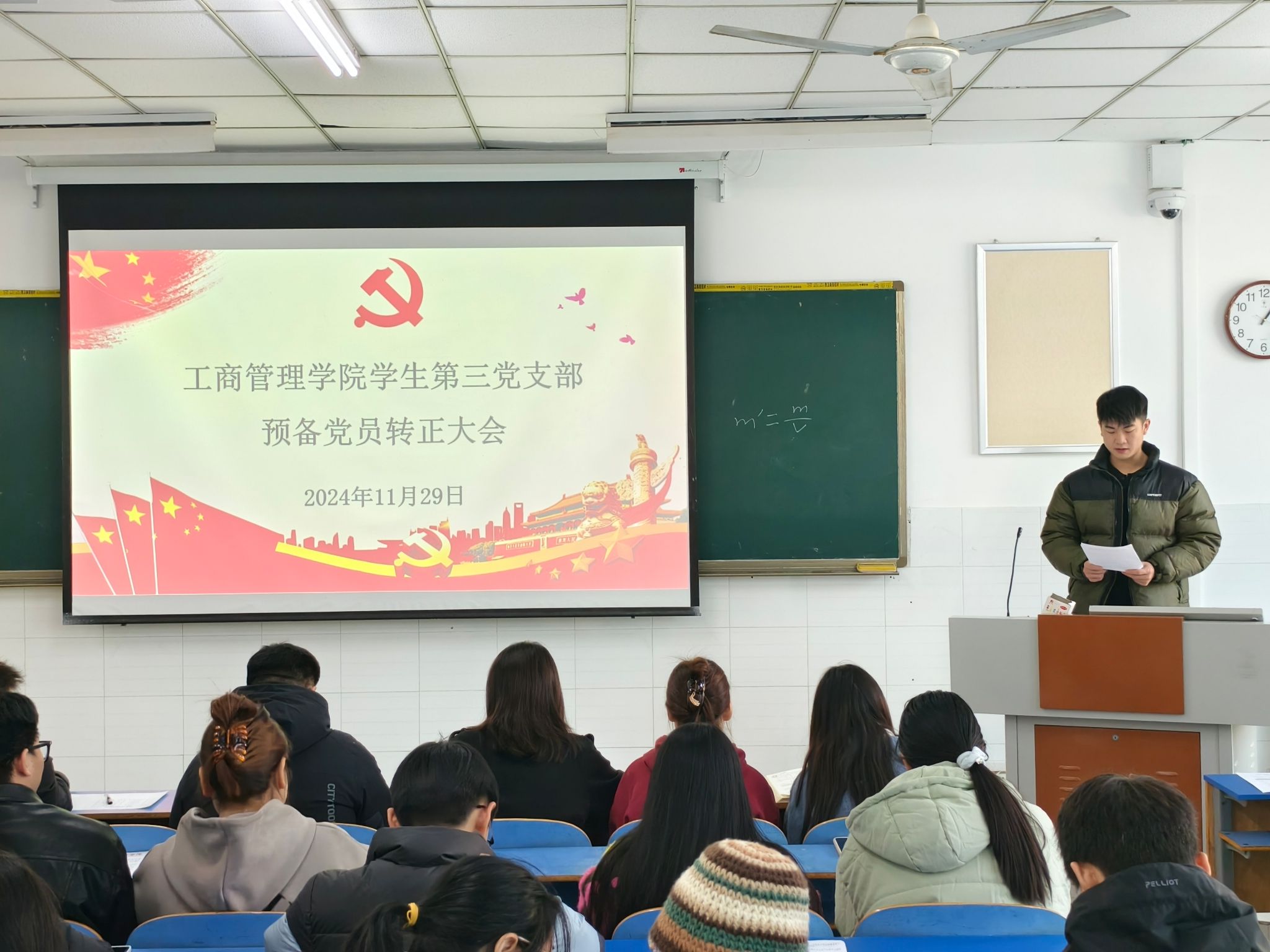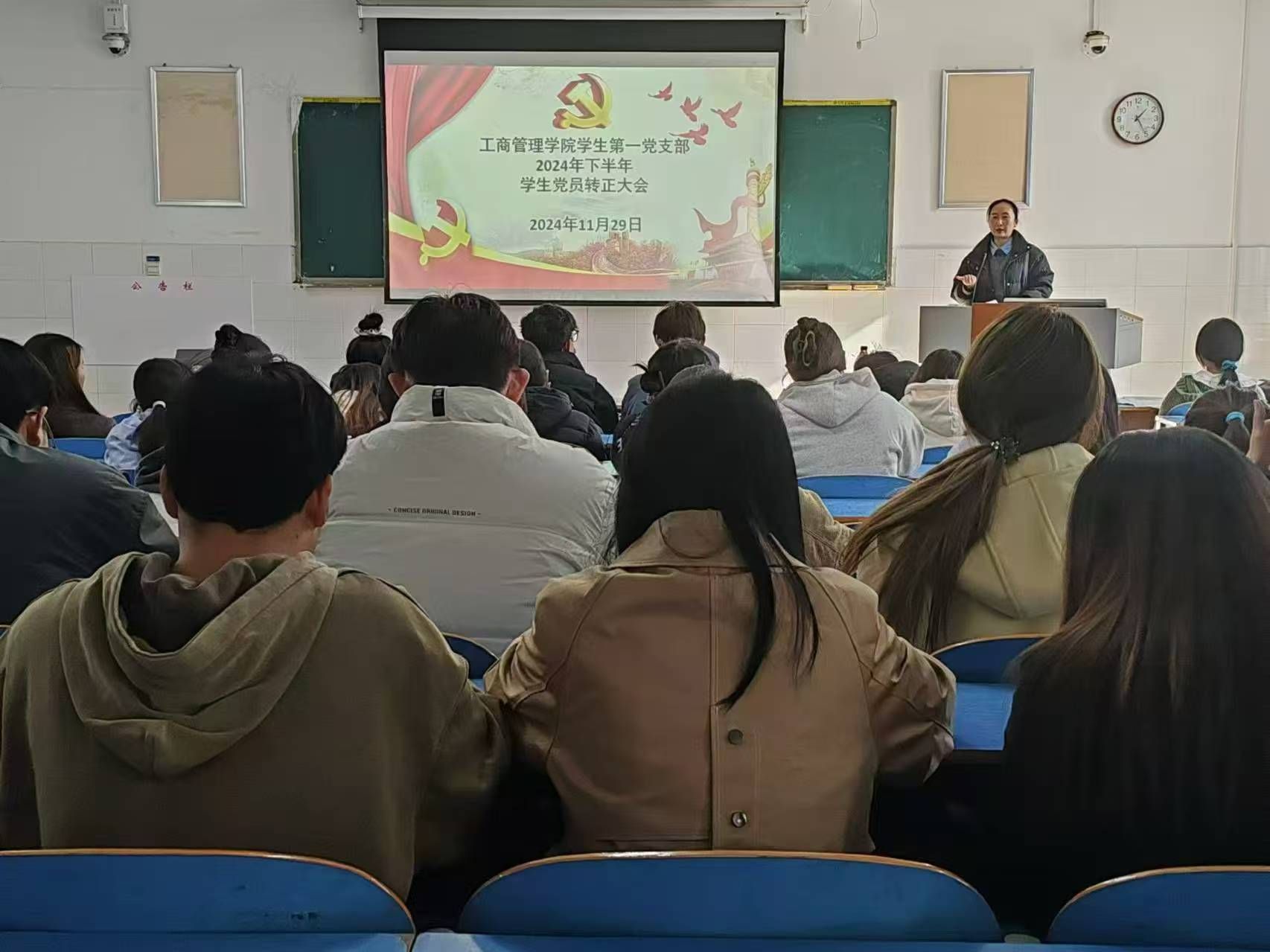 为切实规范党员发展流程,严把党员发展质量关,焕发党组织新活力,ok138cn太阳集团古天乐于2024年11月29日中午12:30在E202、E203、E205教室分别召开学生第一、二、三党支部2024年下半年预备党员转正大会。本次党员大会分别由学生第一党支部书记贾雪、学生第二党支部书记郝晨晗和学生第三党支部书记付裕主持,学院各支部全体党员参与本次会议。