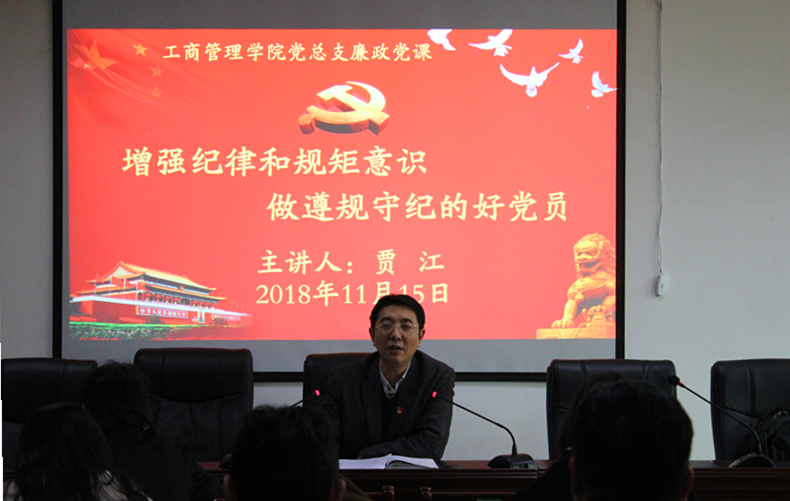 贾江以“增强纪律和规矩意识,做遵规守纪的好党员”为题,从党的十八大以来的防腐态势;党的十八大后的反腐成绩单;教学院系在党风廉政建设方面存在的风险点三个方面为党员们讲解了加强党风廉政建设,增强纪律和规矩意识的重要性。他在讲课中通过大量生动的事例和数据讲述了十八大以来党中央强力反腐的决心和成绩,指出作为一名党员和干部要正确认识党的十八大以来全面从严治党,坚持党要管党的紧迫性和必要性,自觉增强“四种意识”,坚决做到“两个维护”,认真落实“一岗双责”,不断强化作风建设,不断增强纪律和规矩意识,做遵规守纪的好党员。