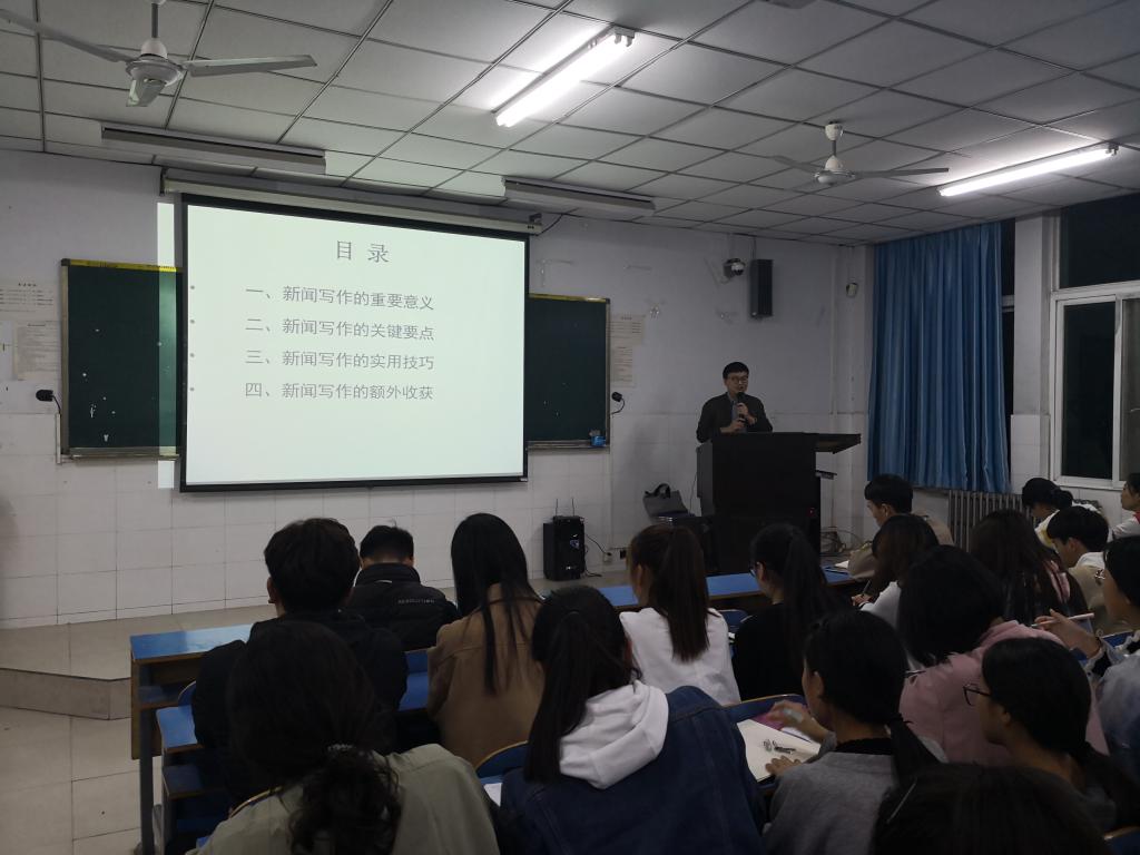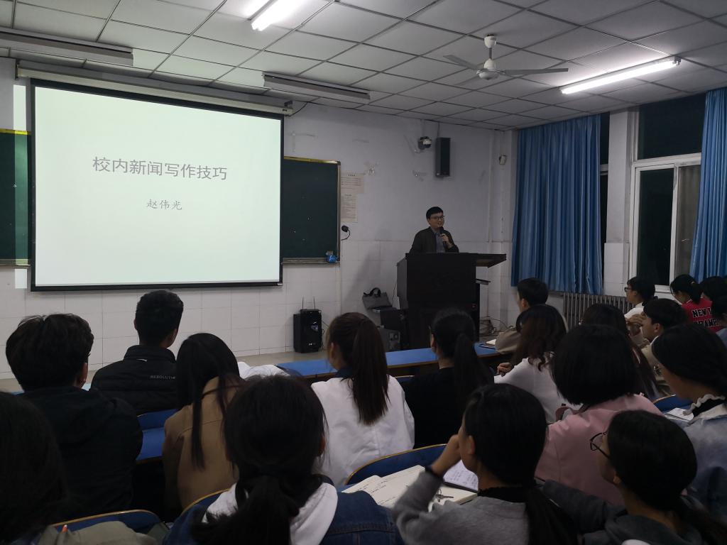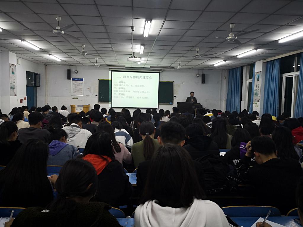 10月31日晚,英才校区教学楼E205教室内座无虚席,气氛活跃。为提高学生干部的新闻写作水平,ok138cn太阳集团古天乐在此举办学生团干部专题培训,特邀学生处赵伟光老师讲授校内新闻写作技巧。ok138cn太阳集团古天乐200余名学生干部聆听讲座,讲座由学院团总支书记周倩主持。