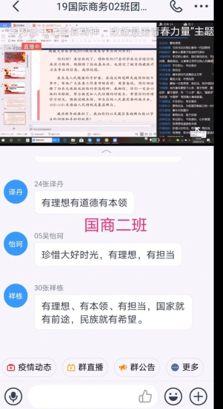 团课伊始,团支书带领同学们学习习近平总书记给北京大学援鄂医疗队和在首钢医院实习的西藏大学生的两封回信,同学们纷纷表示将牢记总书记的嘱托,与奋战在抗疫一线和各条战线的青年一起,用奋斗书写无悔青春。随后,主持人组织同学们在线观看《全民战役与坚定中国特色社会主义制度自信》(中国人民大学教授王向明)网络主题团课,引导青年团员充分理解国家制度优势,增强制度自信,培养家国情怀,真正做到与祖国一同成长。最后,主持人对本次团课进行总结,引导同学们深刻理解习近平总书记两封回信重要精神内涵,并立足于青年大学生,激励同学们发光发热,将青春之树种在祖国需要的地方。