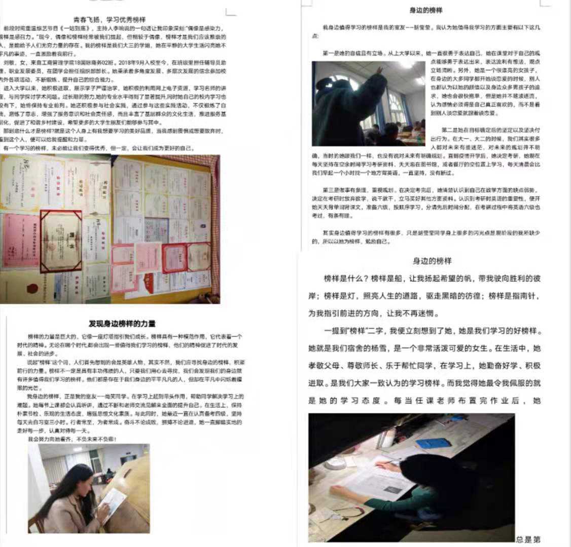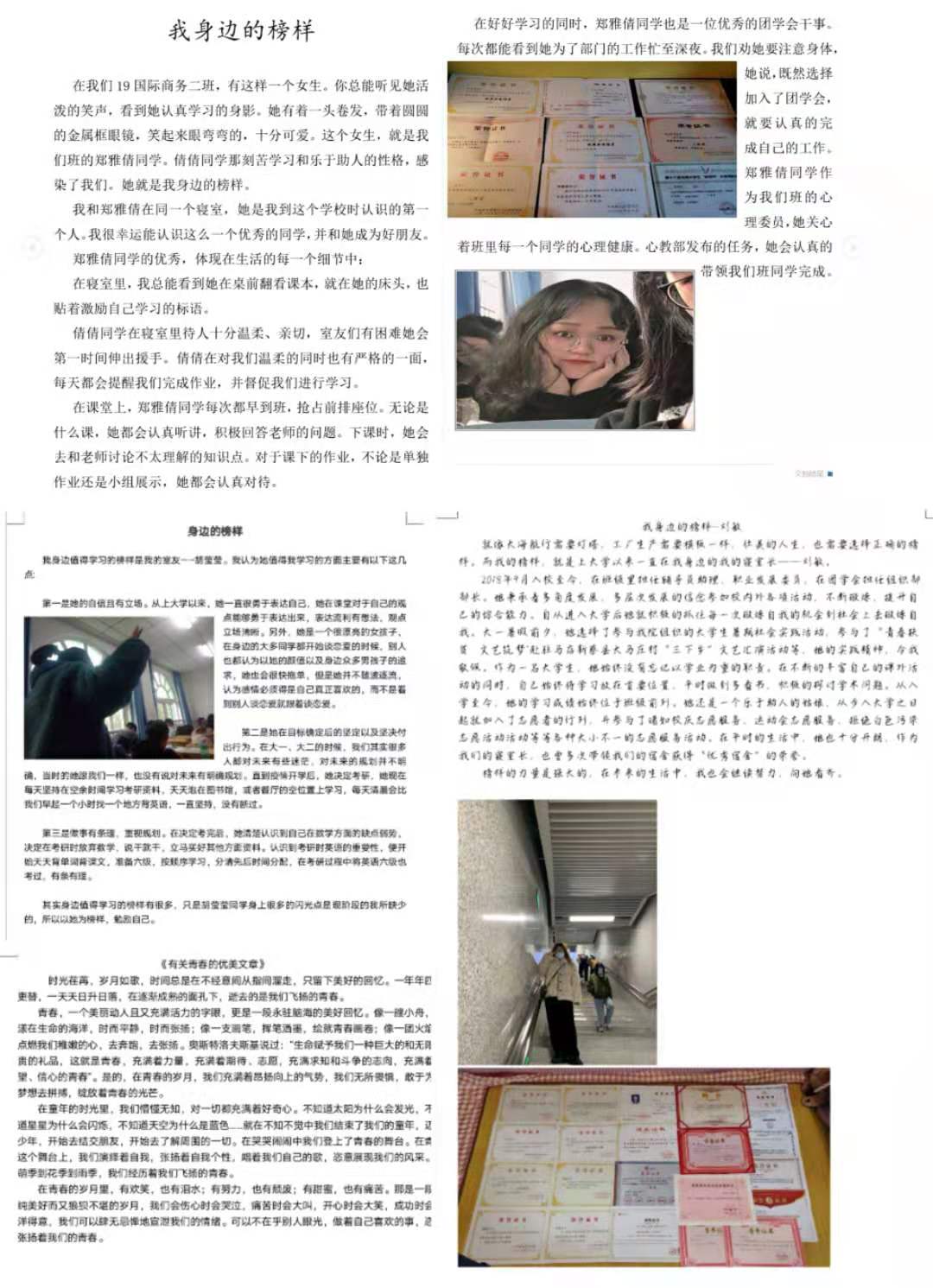 此次“发现身边榜样”推荐活动的时间为2020年11月16日到2020年12月16日。活动期间,同学们踊跃参,认真书写自己的榜样,并且思考自己要改进的地方。这次活动深刻弘扬了“三人行则必有我师”的优秀中国传统文化,让榜样优秀的品质无限传播。在作品评选时,许多同学的优秀事迹纷纷脱颖而出。本次评选活动共选出一等奖五名、二等奖十名、三等奖十八名,其中18级国际商务02班刘敏同学和19国际商务02班郑雅倩同学的故事让同学们感受颇深,刘敏同学从畏惧者到尝试者,她始终不断的跳出舒适圈,积极参加校内外各项活动,多次参与大学生暑假实践活动,把握每一次锻炼的机会,不断充实自己,郑雅倩同学从进入大学以来,她努力学习新技能,参加各类竞赛来锻炼自己,认真的对待每一件事,同时带动自己身边的人一起成长,从学习者到实践者,是一个身份的转变,更是她坚定信念下所付出的行动。两位同学的优秀事迹让让我院学子深刻的体会到青春是用来奋斗的,要一直努力,才能像榜样一样走出精彩的别样人生。