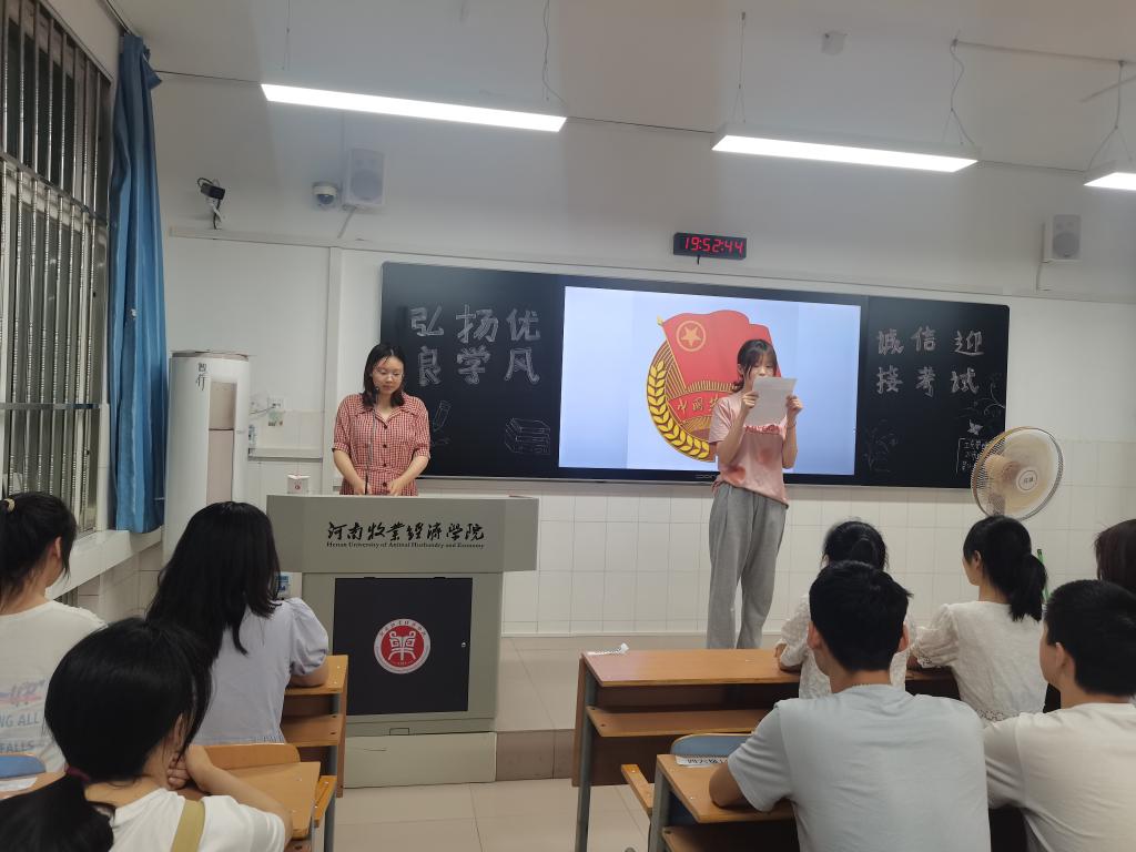 团课伊始,各班团支书宣读诚信考试守则。随后,团支书向同学们讲解了关于考试作弊的危害。考试作弊践踏了诚信理念,加剧了信用危机,影响了同学们学习的积极性,不利于良好学风的形成,严重扰乱了考试公平秩序。20物业01的团支书通过讲述各种因为考试作弊而被处分的案例让同学们清楚的认识到考试作弊的危害,提醒同学们诚信考试。20工程02的学生代表宣读诚信考试的演讲稿,积极的呼吁同学们诚信考试,团课在如潮般的掌声中接近尾声。