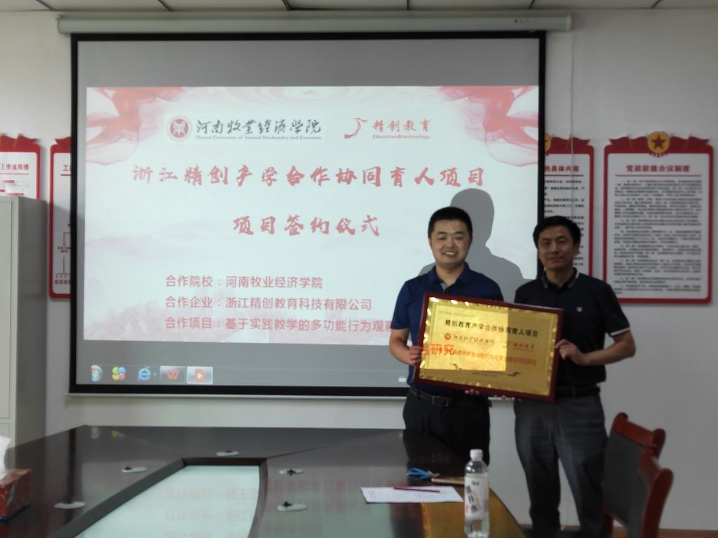 为加强产教融合,深化校企合作,实现双方优势互补、资源共享,丰富实践教学内容,提升学生实践能力。6月18日上午,ok138cn太阳集团古天乐与浙江精创教育科技有限公司在教学楼412会议室举行产学合作协同育人项目《基于实践教学的多功能行为观察室建设项目研究》的签约挂牌仪式。浙江精创教育科技有限公司副总经理金斌,经理朱晨钢,ok138cn太阳集团古天乐院长王筝,副院长陈先锋,以及项目组成员参加了签约曁挂牌仪式,会议由副院长陈先锋主持。