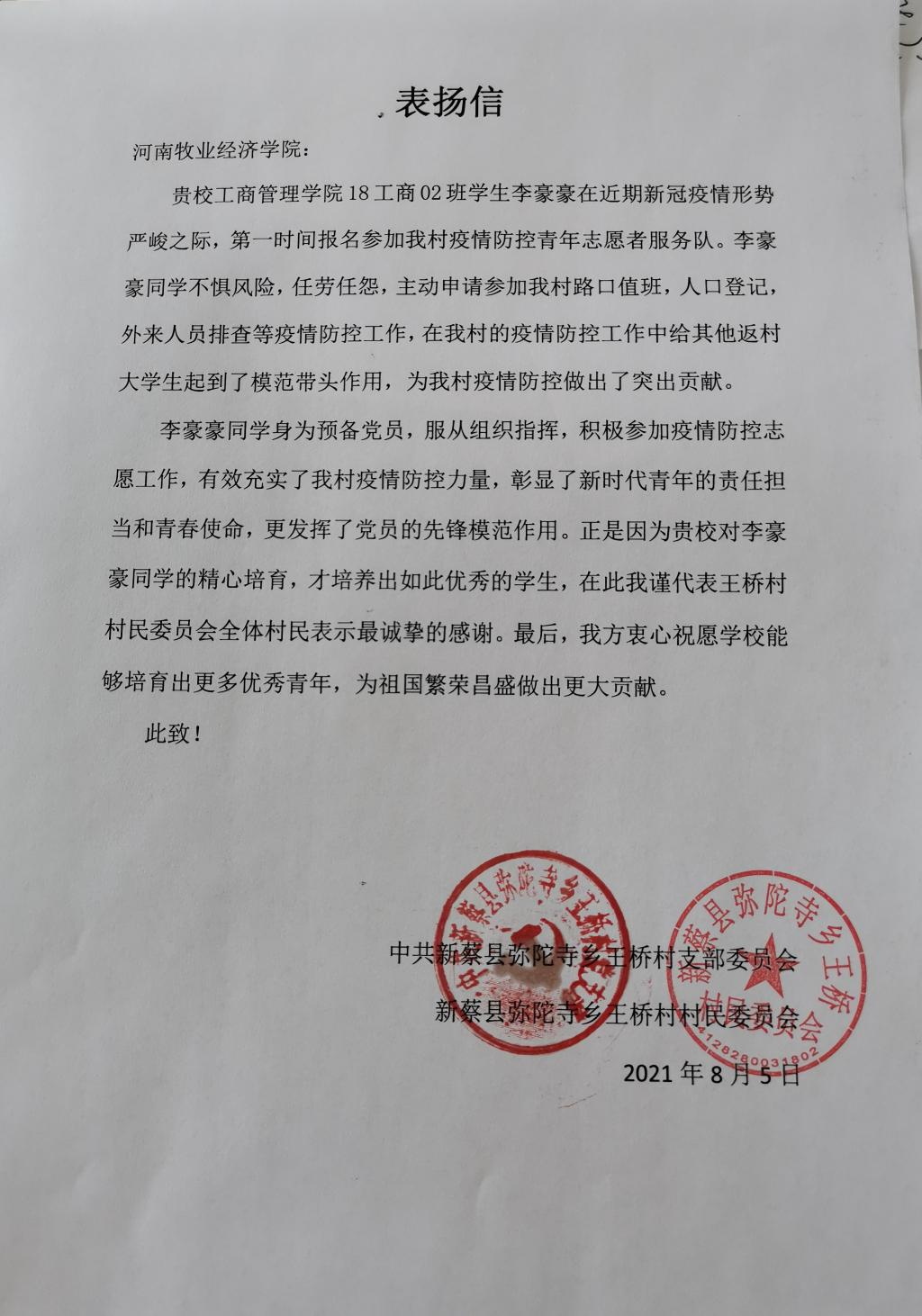 自7月30日,河南省再次爆发新冠肺炎疫情以来,李豪豪所在的王桥村,实行严格的防控措施,建立“网格化+居民联防邻里守望”疫情防控机制,切实加强疫情防控网格化管理,在所有进村的路口设立检查站,对往返人员及车辆进行登记。他与村内其他几位党员组成了党员志愿服务队,开展志愿者活动。他说:“我作为一名预备党员,受学校和院内系统的党的培养教育,我有责任和义务,在家乡疫情防控中做一些力所能及的事。”他的不分昼夜志愿活动受到了当地村委会和群众的一致好评和表扬。