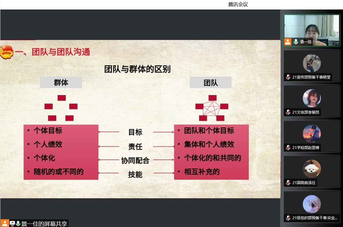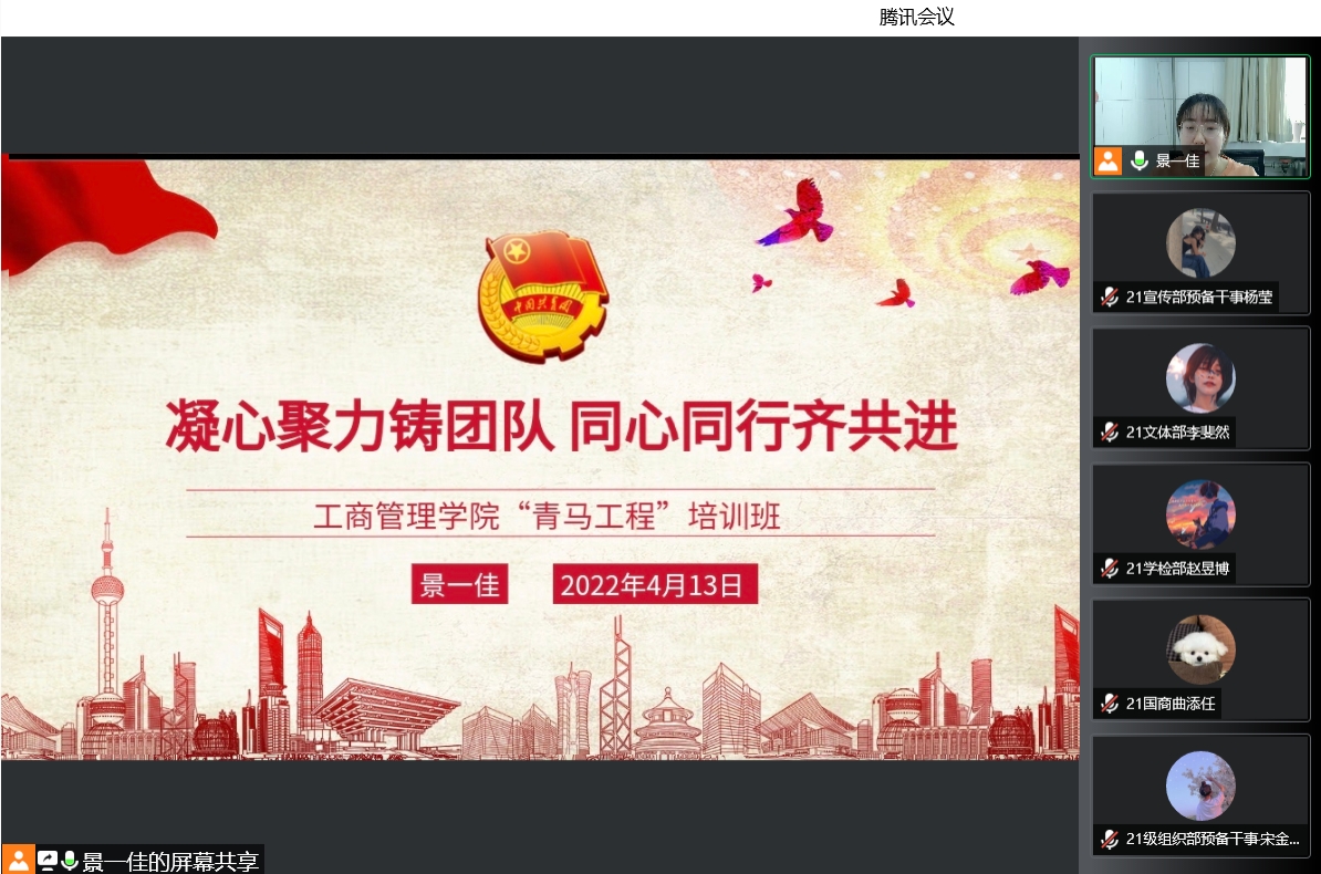 为提高学生干部的团队意识,加强组织建设,增强团队凝聚力。4月13日ok138cn太阳集团古天乐“青马工程”大学生骨干培训第三讲“凝心聚力铸团队,同心同行齐共进”线上主题讲座在腾讯会议举行。此次讲座由辅导员景一佳主讲,全体青马学院参加了本次培训。