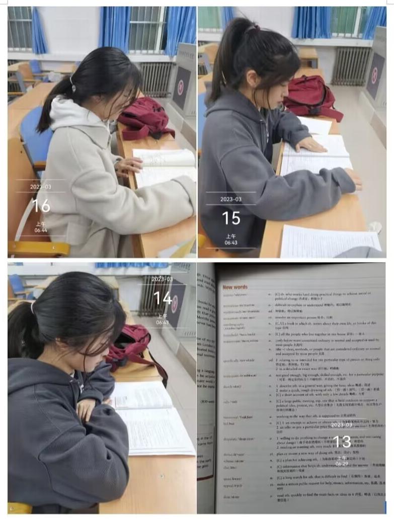 本次活动通过照片、视频等形式打卡记录,展示晨读魅力,记录清晨美好。伴着清晨第一缕阳光,同学们陆续开始晨读打卡。22工商02班赵雪帆同学以端正的姿势手捧英语书,大声朗读,激发同学们阅读热情,展现出昂扬向上的朝气和活力。同学们纷纷表示深受鼓舞,读书充满动力,感悟阅读魅力,让读书成为一种习惯。