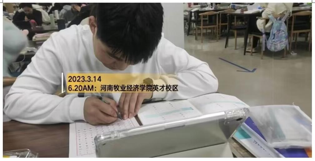 21营销01班刘言同学端坐桌前,安静学习、静心思考、预习知识、发现不足、认真记录,享受晨读愉悦,沐浴崇高精神洗礼,清晨的低气温也无法阻挡他对自我学习的热情和动力。