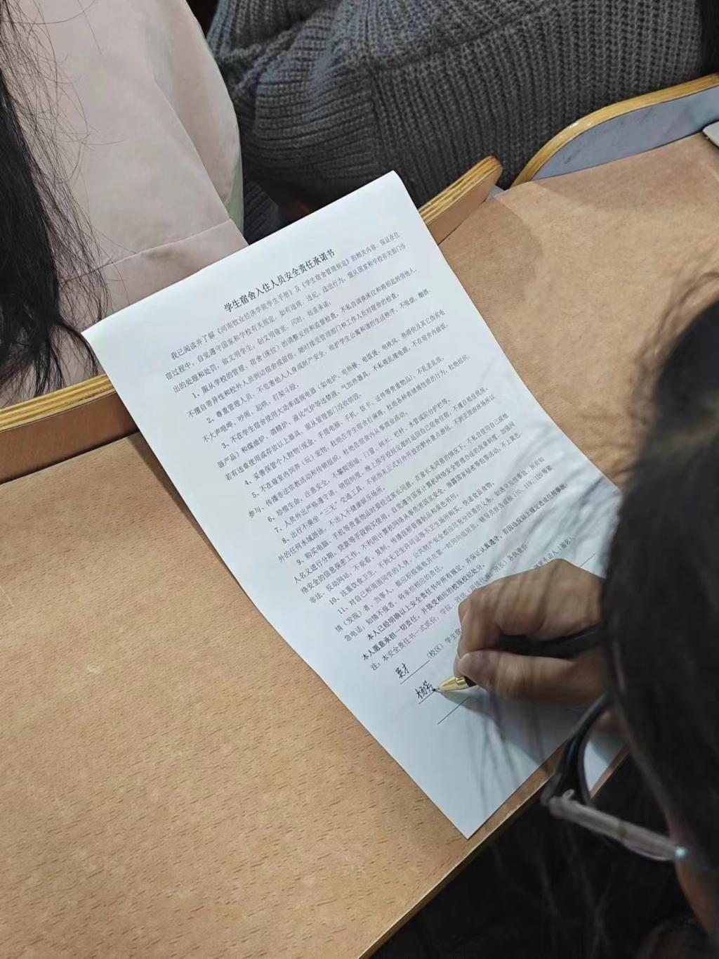 讲座上,王兴萌围绕廉洁的内涵、廉洁的重要性以及大学生廉洁修身的意义三个方面进行讲解。她指出,廉洁是中华民族优秀的传统文化,要不断加强新时代廉洁文化建设,同时勉励同学们深入学习中国共产党党员的廉洁故事,在榜样的鼓舞下,树立正确的人生观和价值观,将廉洁教育奉为人生必修课,找准自己的人生航标,勤奋做事,廉洁做人。接着,王兴萌主要就基础文明教育的含义与意义、劳动教育、学生公寓相关管理规定等部分为新生进行了全面详细的讲述,让新生认识到大学生基础文明教育的重要性,鼓励同学们要在生活中逐步养成稳固而良好的行为习惯,不断提升自己的思想道德素质和文明素养。随后组织同学们签订《学生宿舍入住人员安全责任承诺书》,引导新生自觉遵守大学生文明公约,坚决告别不文明行为。讲座最后,王兴萌对新生们寄予期望,她希望同学们将反腐倡廉的思想根植于自己内心,助力学校清廉校园建设,牢记大学生基础文明规范。