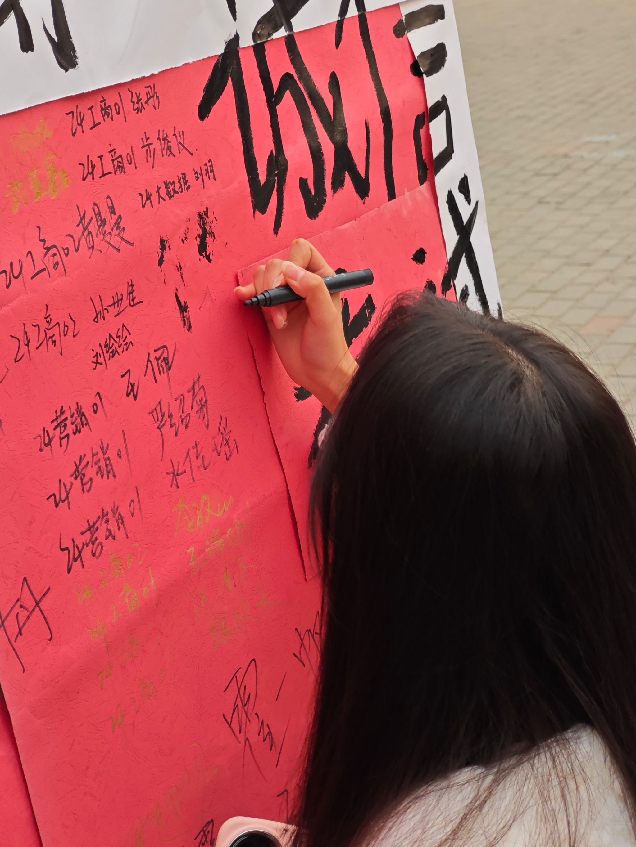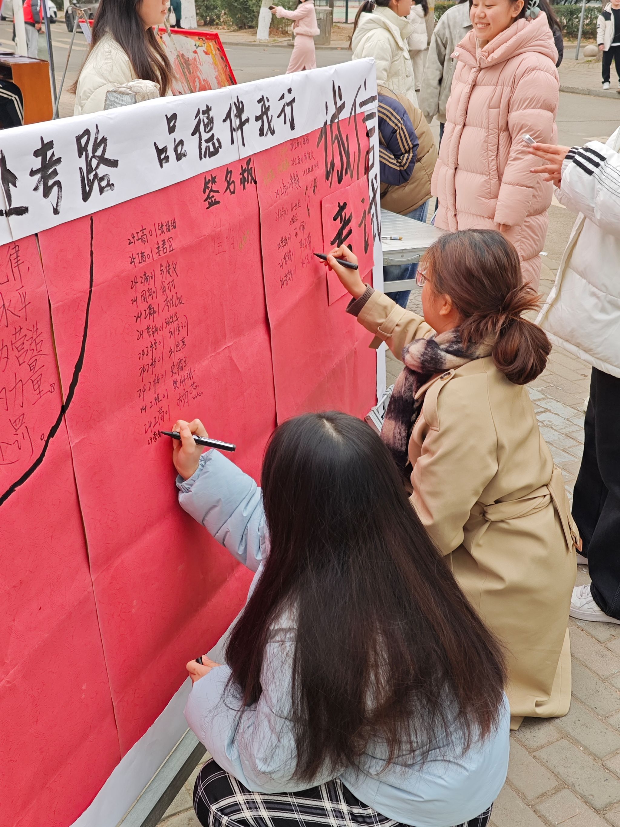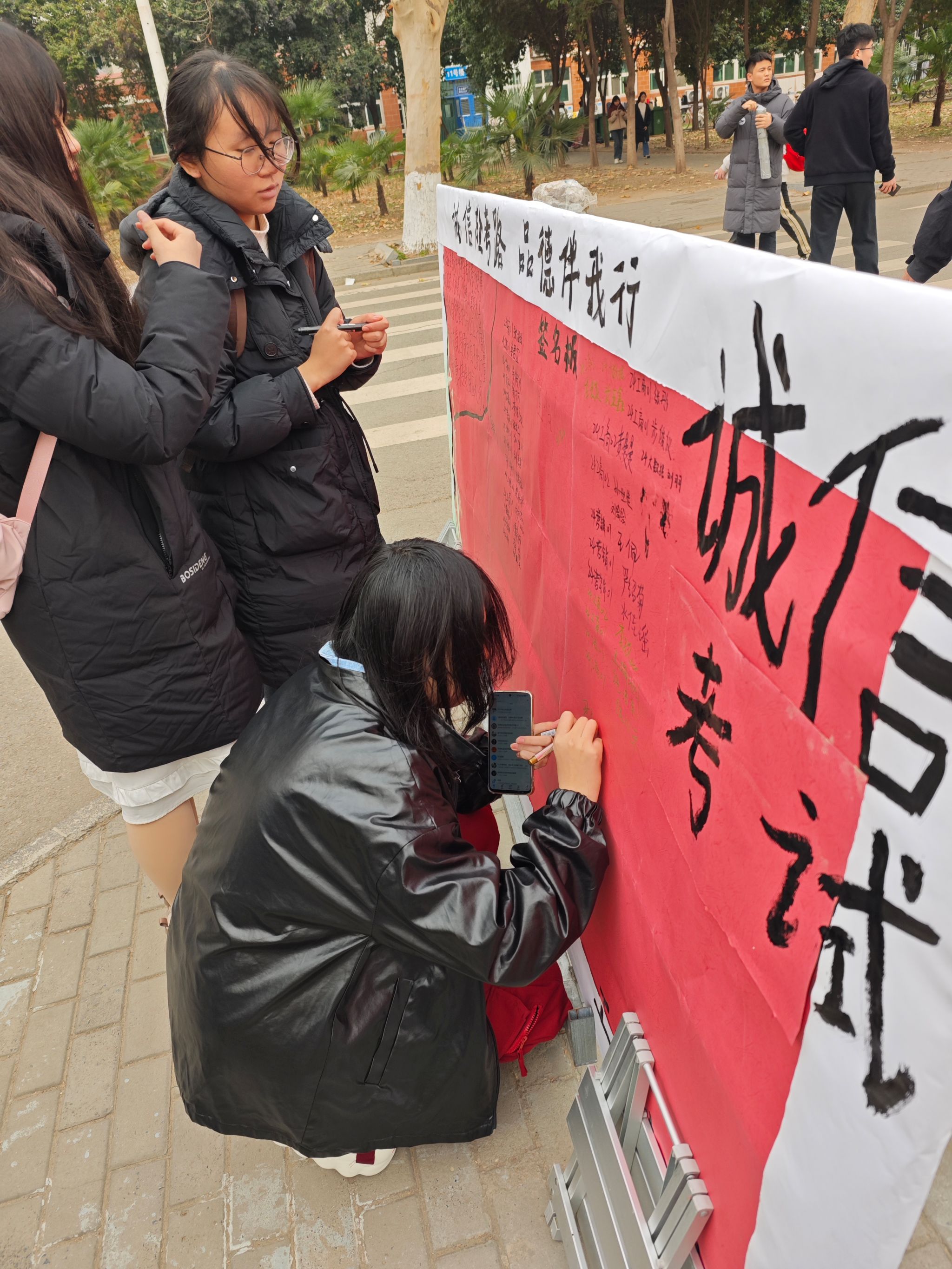 活动现场,一张引人注目的红色展板矗立在中央,上面书写着鲜明的“诚信考试”标语,并详细罗列了倡导诚信考试的具体要求和殷切寄语。这张展板吸引了大量同学驻足围观,仔细阅读展板上的每一条内容。与此同时,工作人员主动上前,向同学们详细介绍活动的主题和参与要求,耐心解答他们的疑问,并着重强调了诚信考试对个人素养和考试纪律的重要性,引导同学们深刻认识到诚信考试的意义和价值,从而充分调动了大家的参与热情。在工作人员的有序引导下,同学们满怀敬畏之心,纷纷在寄语旁认真的、一笔一划的写下自己的名字。这一签字行为不仅是对自己诚信考试的郑重承诺,更是对优良学风的发扬与传播。随着活动的进行,展板上逐渐布满了同学们的签名,同学们驻足交流感悟,相互激励与监督,共同营造了浓厚的诚信考试氛围。