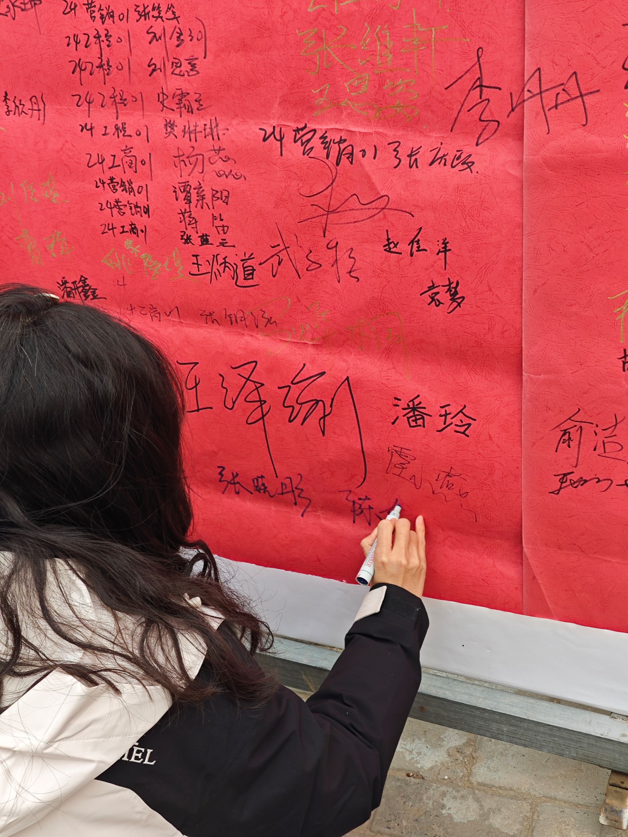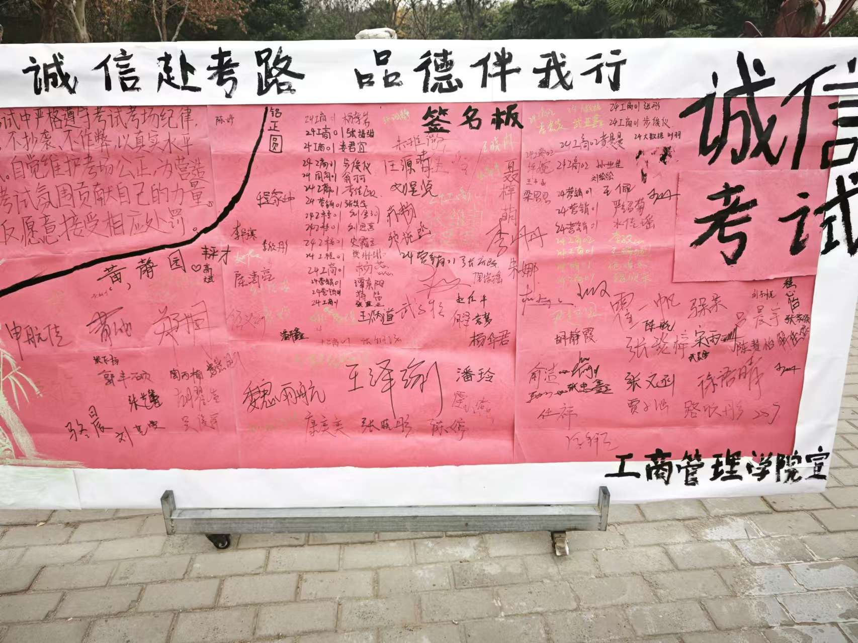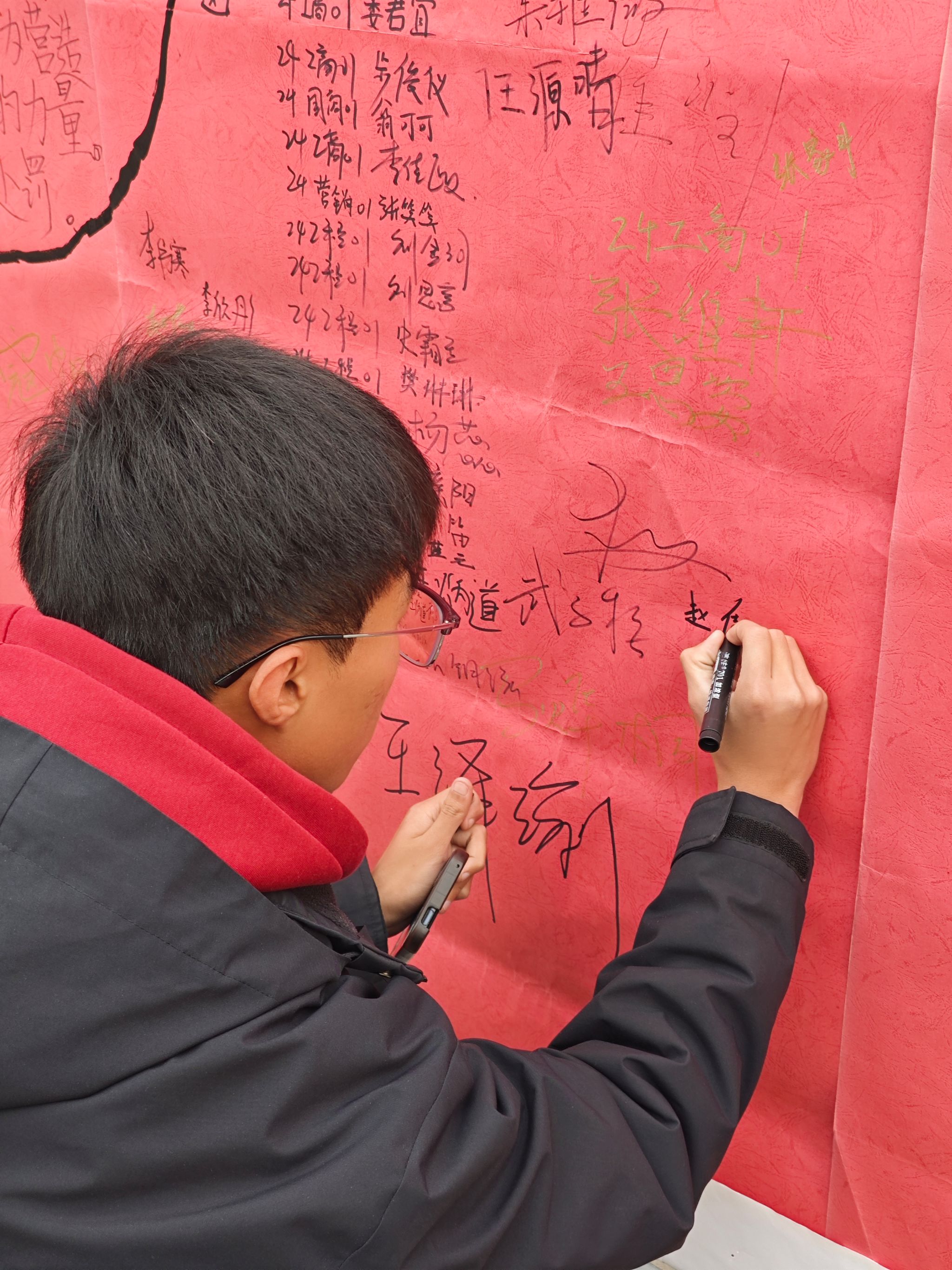 活动现场,一张引人注目的红色展板矗立在中央,上面书写着鲜明的“诚信考试”标语,并详细罗列了倡导诚信考试的具体要求和殷切寄语。这张展板吸引了大量同学驻足围观,仔细阅读展板上的每一条内容。与此同时,工作人员主动上前,向同学们详细介绍活动的主题和参与要求,耐心解答他们的疑问,并着重强调了诚信考试对个人素养和考试纪律的重要性,引导同学们深刻认识到诚信考试的意义和价值,从而充分调动了大家的参与热情。在工作人员的有序引导下,同学们满怀敬畏之心,纷纷在寄语旁认真的、一笔一划的写下自己的名字。这一签字行为不仅是对自己诚信考试的郑重承诺,更是对优良学风的发扬与传播。随着活动的进行,展板上逐渐布满了同学们的签名,同学们驻足交流感悟,相互激励与监督,共同营造了浓厚的诚信考试氛围。