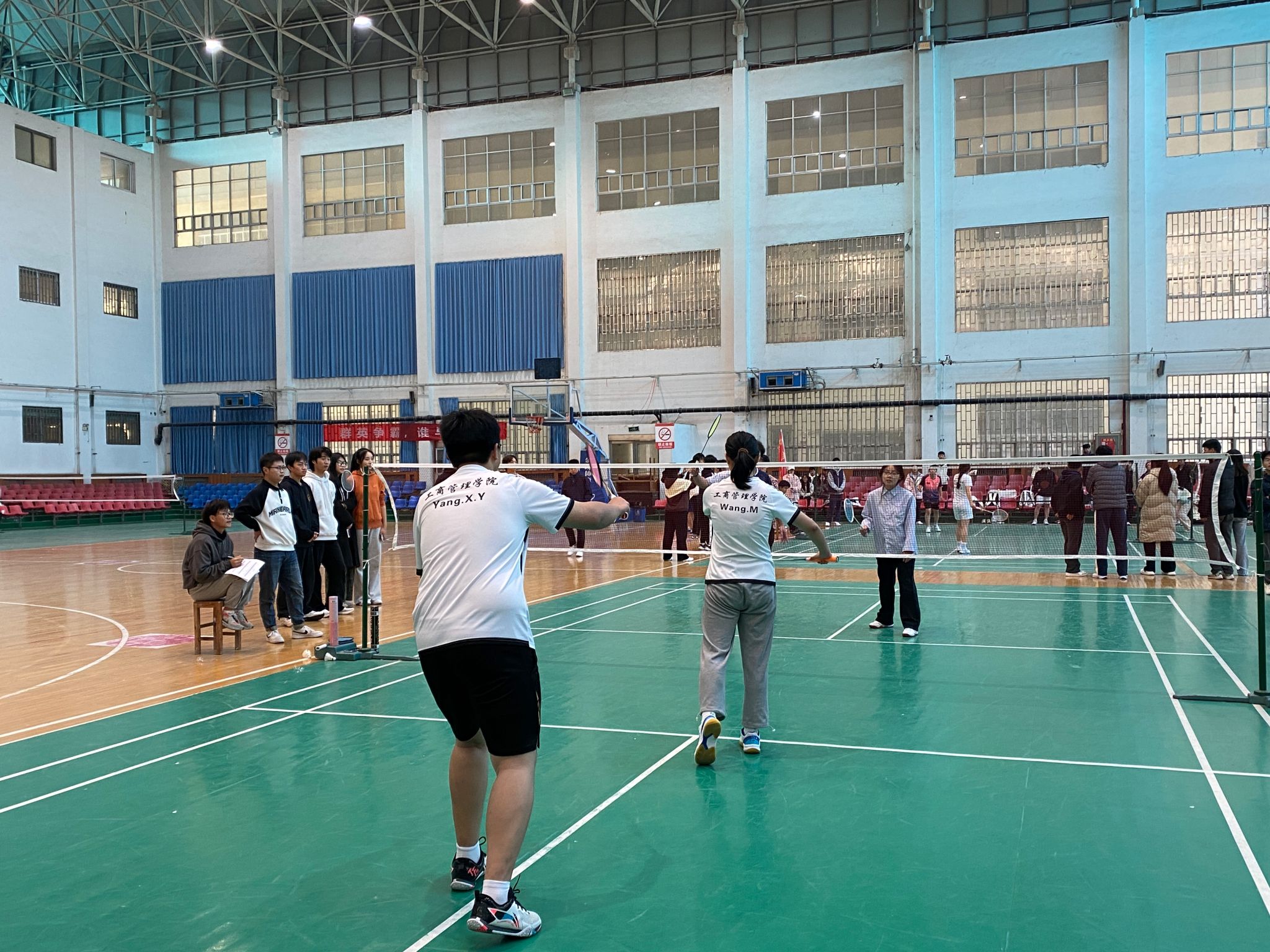 在羽毛球决赛中,参赛球员精神抖索,斗志昂扬。单打比赛,选手们都全身贯注,在场地内快速移动,每一分的争夺都十分精彩。双打比赛更是精彩连连,搭档间的默契配合是取胜的关键,他们每一次进攻都充满力量,每一次防守都密不透风。展现了良好的竞技水平与体育精神,荣获三校区羽毛球团体赛冠军。