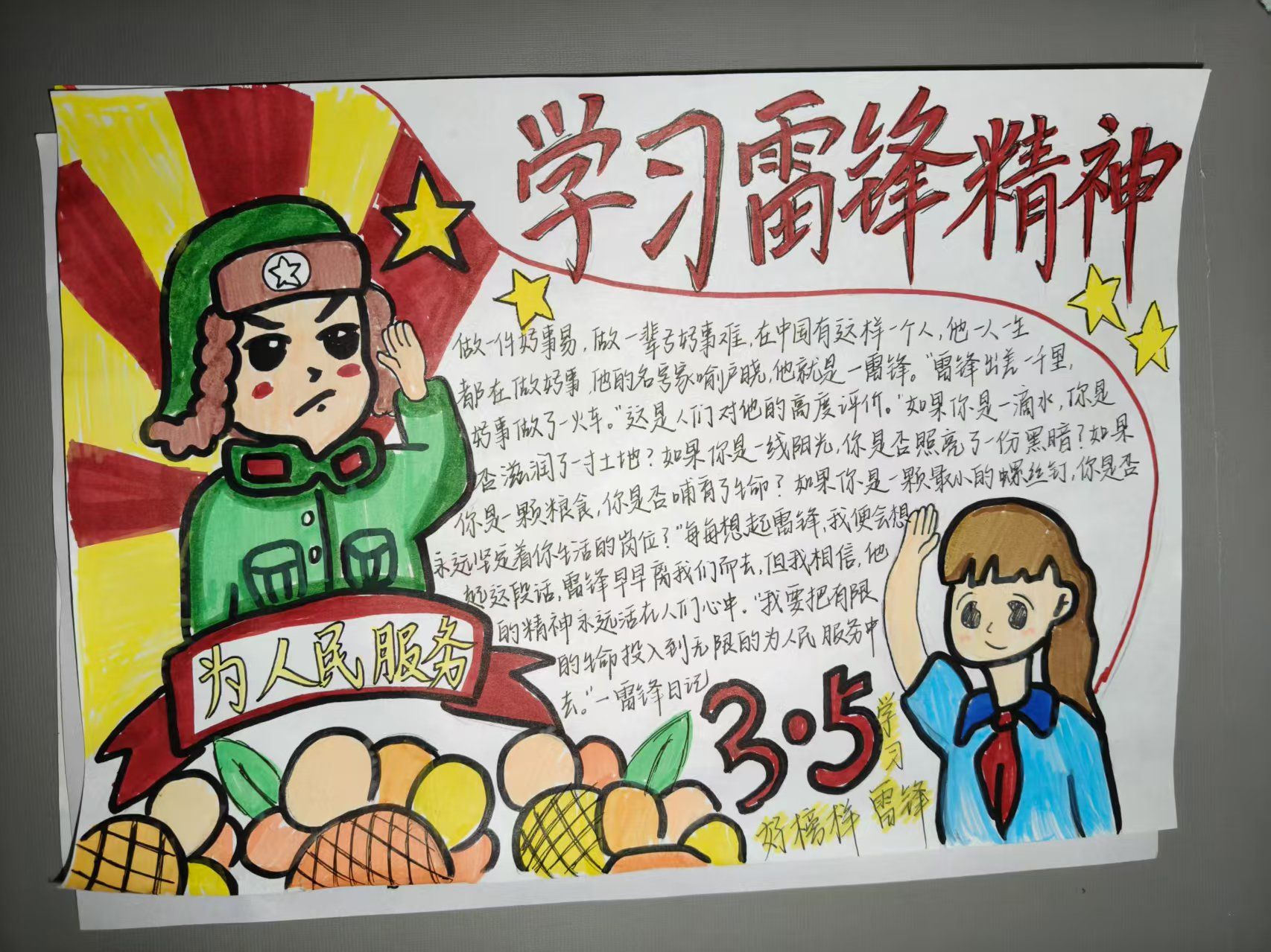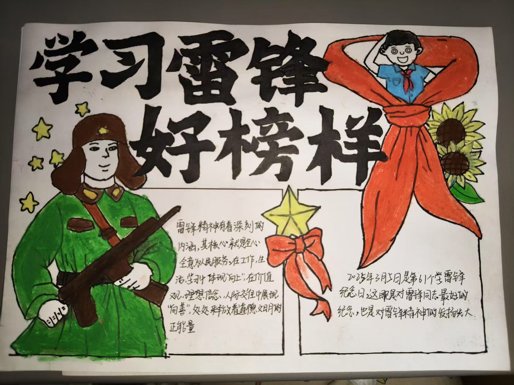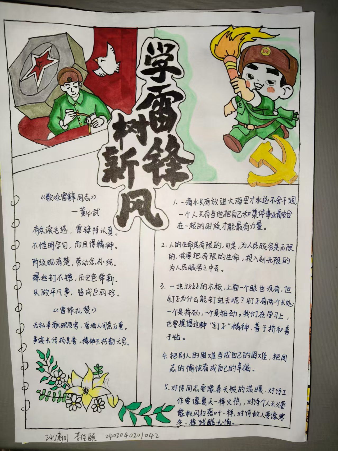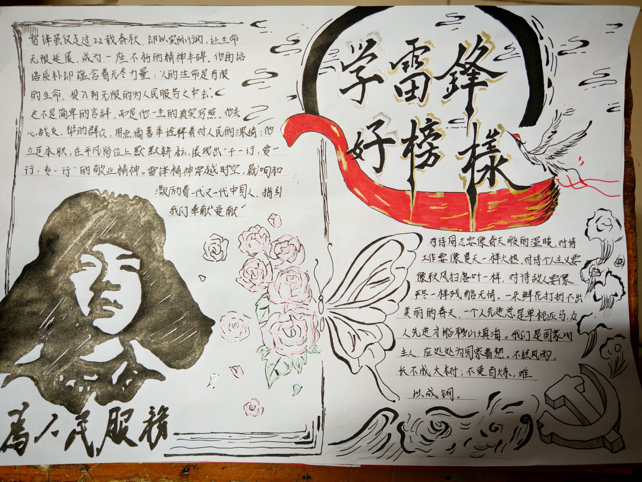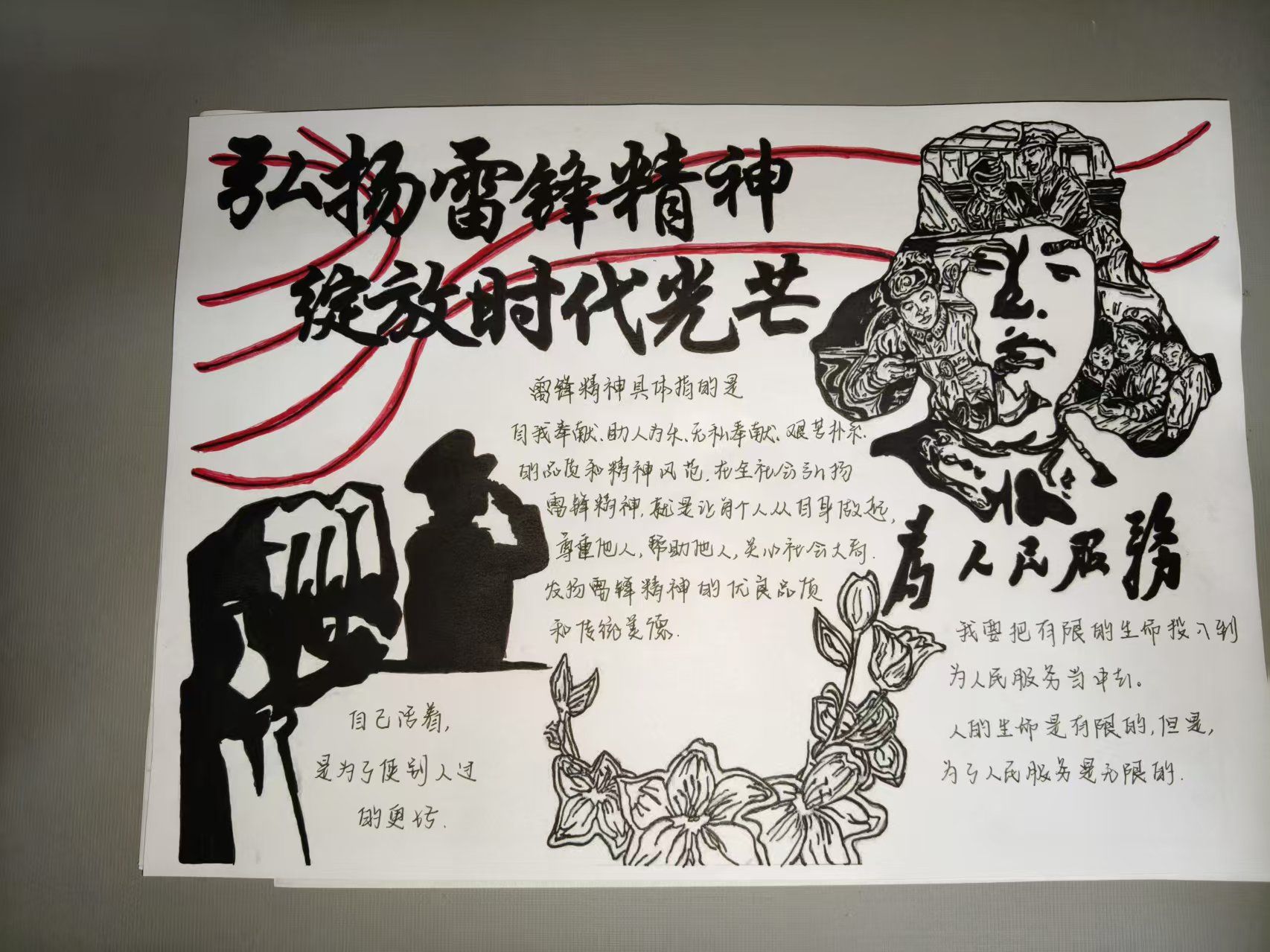 活动期间,同学们紧扣主题,充分发挥创意,精心创作出一幅幅内容积极向上、生动展现雷锋精神的手抄报。从雷锋的生平事迹到雷锋精神在当代社会的传承意义,同学们以画笔为媒介,深刻表达了对雷锋精神的理解与感悟。这些作品不仅展现了同学们扎实的绘画功底,更体现了他们对雷锋精神的高度认同与积极传承。同时,诗词作品也同样精彩纷呈。同学们饱含深情,以笔为剑、以墨抒情,紧扣主题创作出一首首动人的诗歌,字里行间满溢着对雷锋的深切敬仰,深刻诠释了雷锋精神的时代价值。这些手写诗词作品字迹工整美观,情感质朴真挚,充分展现了同学们深厚的文学素养与对雷锋精神的独特体悟。同学们纷纷表示,通过此次活动,他们对雷锋精神有了更为深刻的认识与理解,并将把雷锋精神内化于心、外化于行,用实际行动诠释新时代雷锋精神。