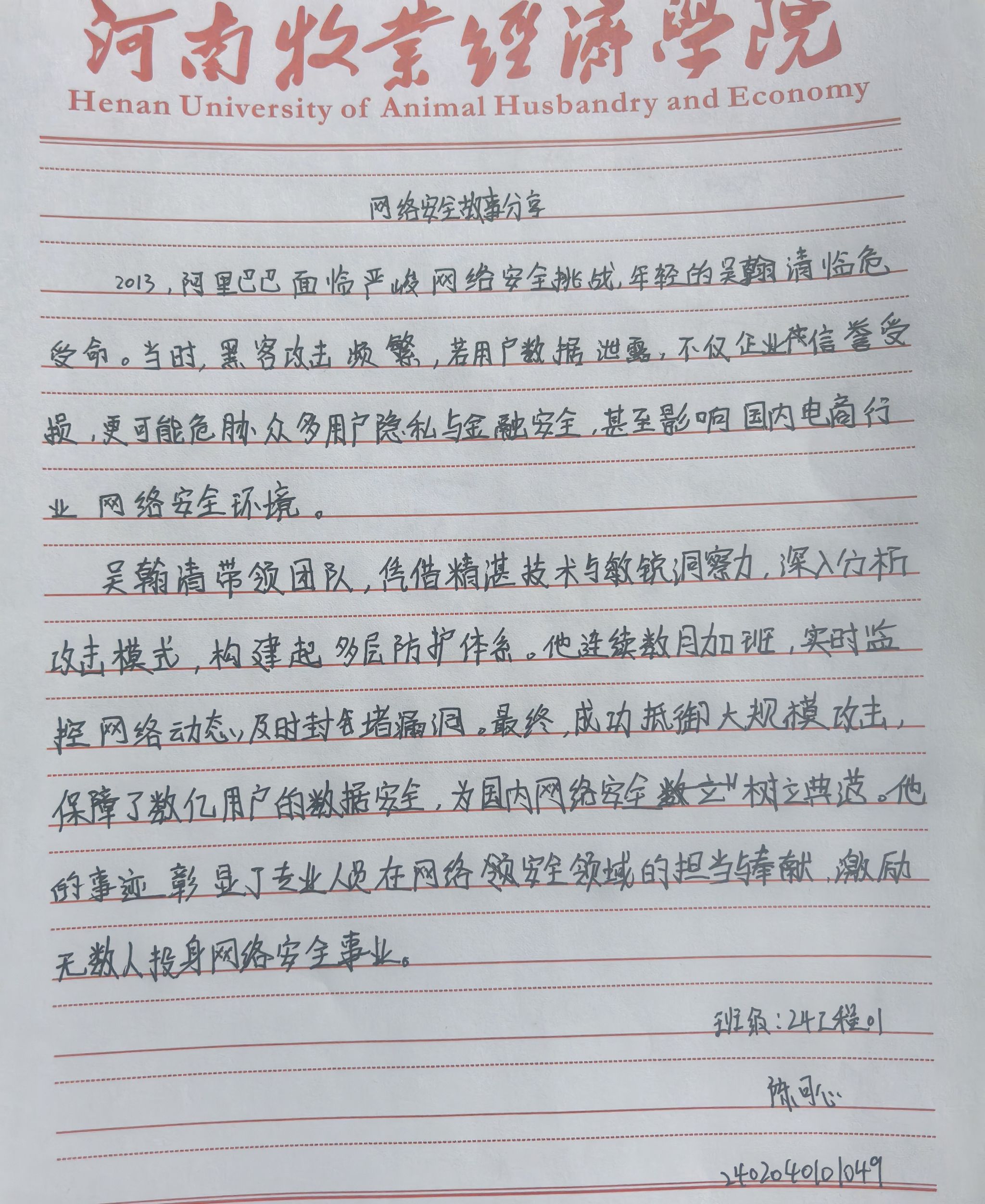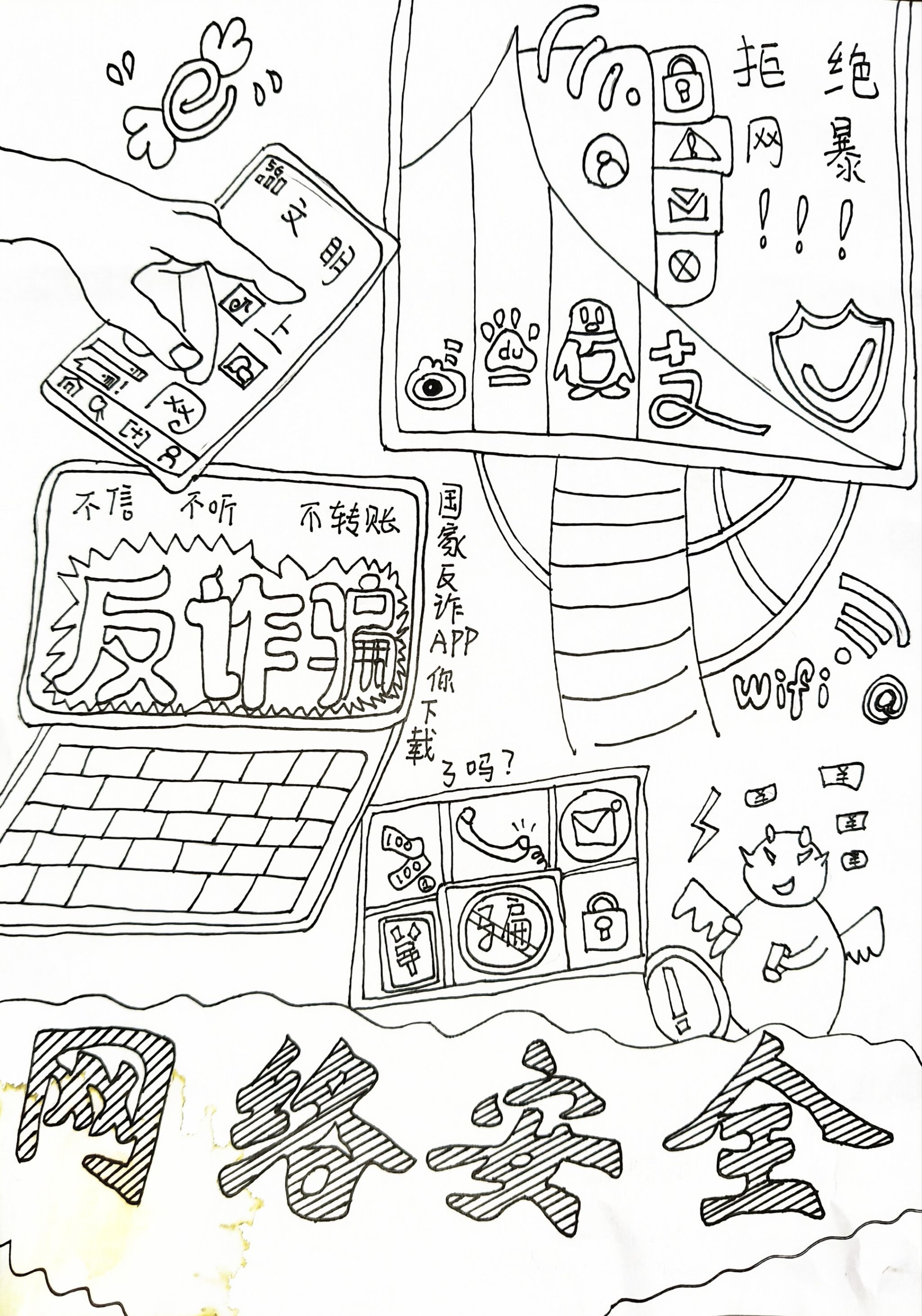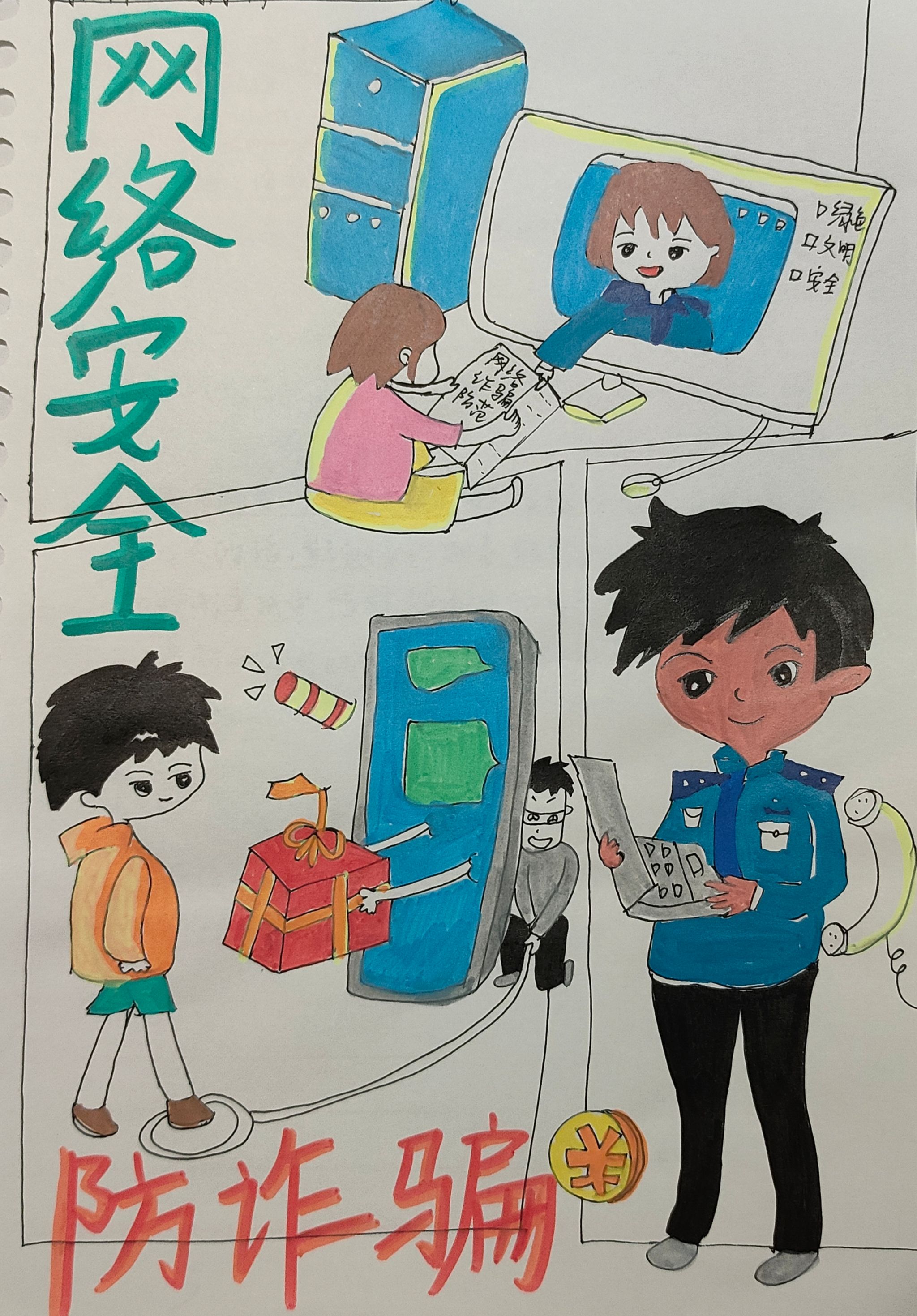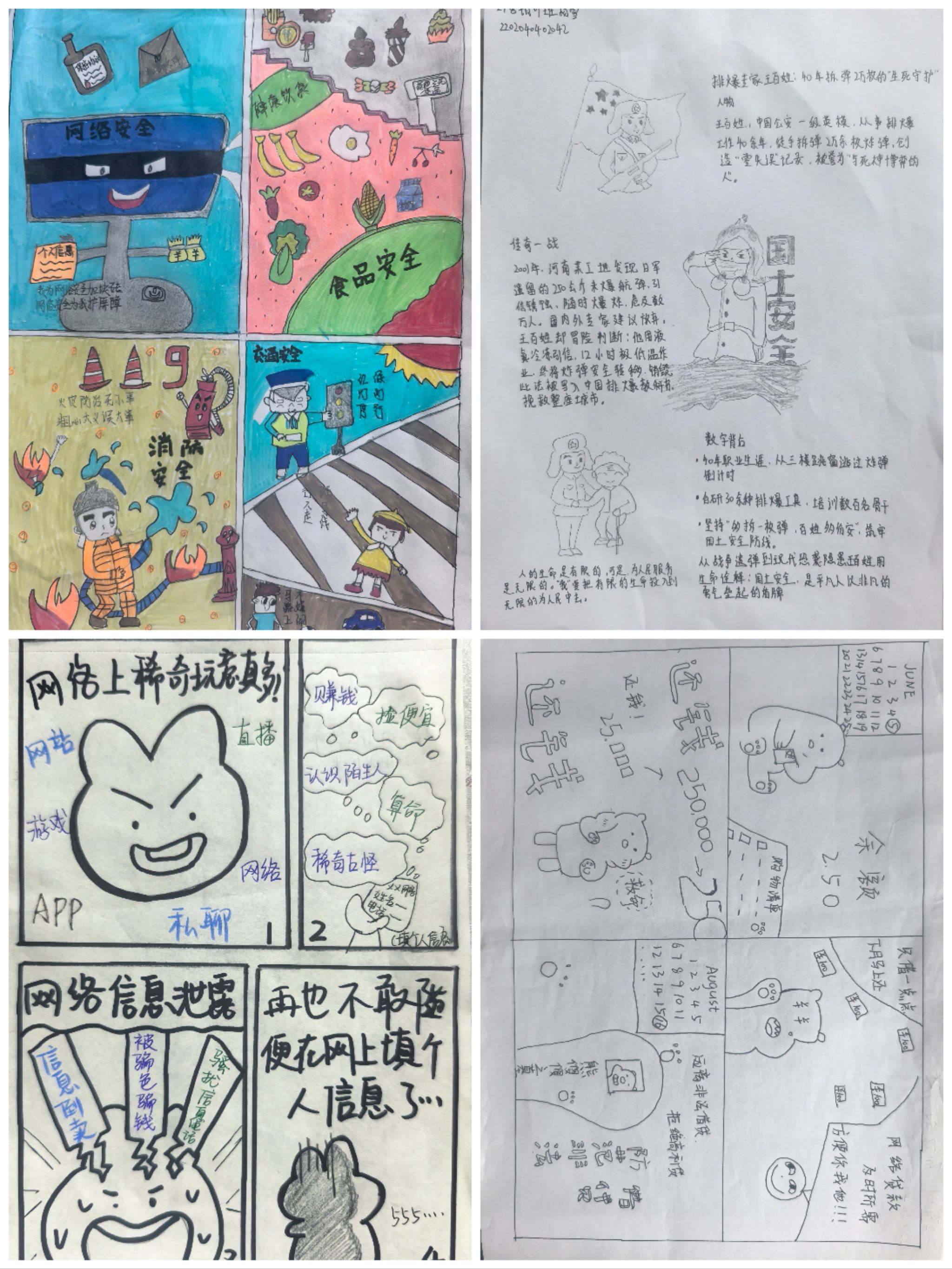 活动中,同学们通过多维度、多层次的实践形式积极参与,提交了丰富多样的原创作品。在“安全先锋故事我来讲”环节,参与者通过文献研究、实地访谈等方式深度挖掘素材,聚焦政治安全、国土安全、网络安全等领域,撰写了真实感人的先锋事迹。同学们或结合专业课程,分析反诈宣传、数据安全等案例,以学术视角诠释安全实践;或深入基层,采访工作者,用细腻笔触还原其守护国家安全的动人细节。同时,在“绘声绘色话安全”漫画创作中,同学们通过手绘、数位板绘图等方式,将安全故事转化为视觉语言。许多作品以多格漫画分镜叙事,通过人物群像与场景融合,生动刻画了边防、消防、网安等不同领域的先锋形象,充分展示了活动的广度与深度,进一步彰显了艺术表达力。