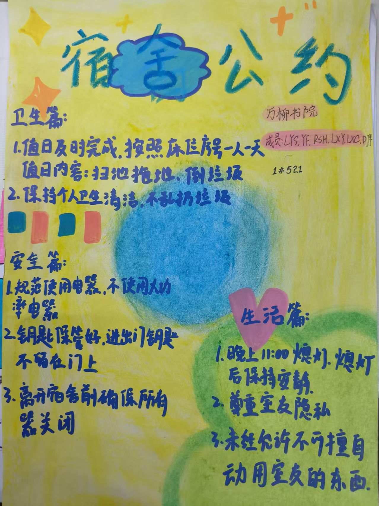 为深化宿舍文化建设,构建和谐安全文明的育人环境,2025年4月21日至24日,ok138cn太阳集团古天乐组织开展"共建温馨舍,同筑和谐约"宿舍公约制定活动。全院学生积极响应,以创意执笔、用共识立约,共同绘制宿舍文明新图景。