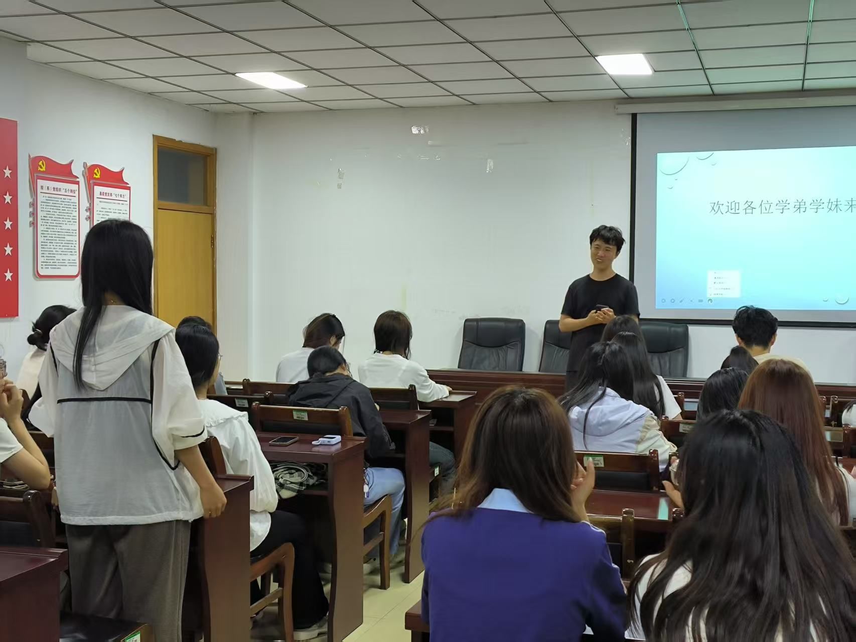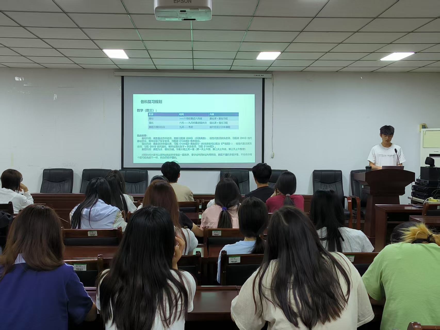 分享会上,赵铭鑫率先围绕备考策略展开讲解。他系统拆解各学科复习规划,着重强调英语单词积累需贯穿考研全程,数学学习应立足基础题型、反复强化练习,并展示个人复习计划表,直观呈现合理规划的重要性。另外,他还分享了通过定期运动缓解压力、保持积极心态的方法。 随后,张浩哲从备考过程、调剂复试及个人感悟三方面分享经验。他将考研比作充实的人生旅程,指出这不仅是知识的考验,更是毅力与心态的挑战。他提醒同学们要找到适合自己的备考节奏,避免盲目攀比,并鼓励大家以平和心态看待结果,重视备考过程中的成长。 在互动交流环节,同学们踊跃提问,围绕考研复习策略、院校专业选择、复试准备等方面提出诸多疑问。两位同学结合自身经历,耐心细致地进行解答,毫无保留地分享心得体会与复习技巧,现场气氛热烈,问答互动频繁。