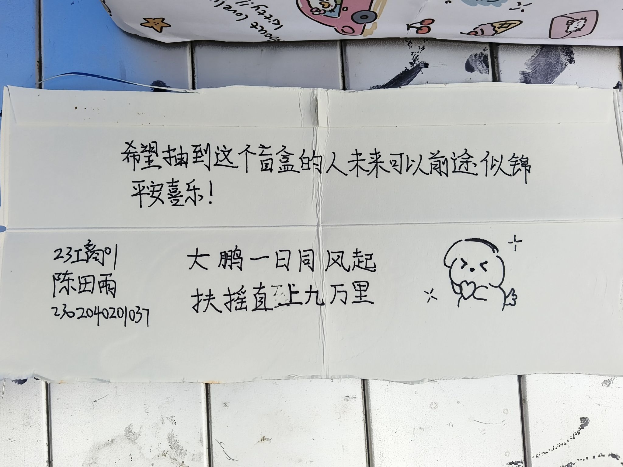 此次活动以盲盒为载体,在人与人之间架起了心灵互动的桥梁,不仅为同学们提供了情绪抒发与心理调适的平台,更极大增强了校园凝聚力与归属感,让和谐友爱的氛围在校园中蔓延。