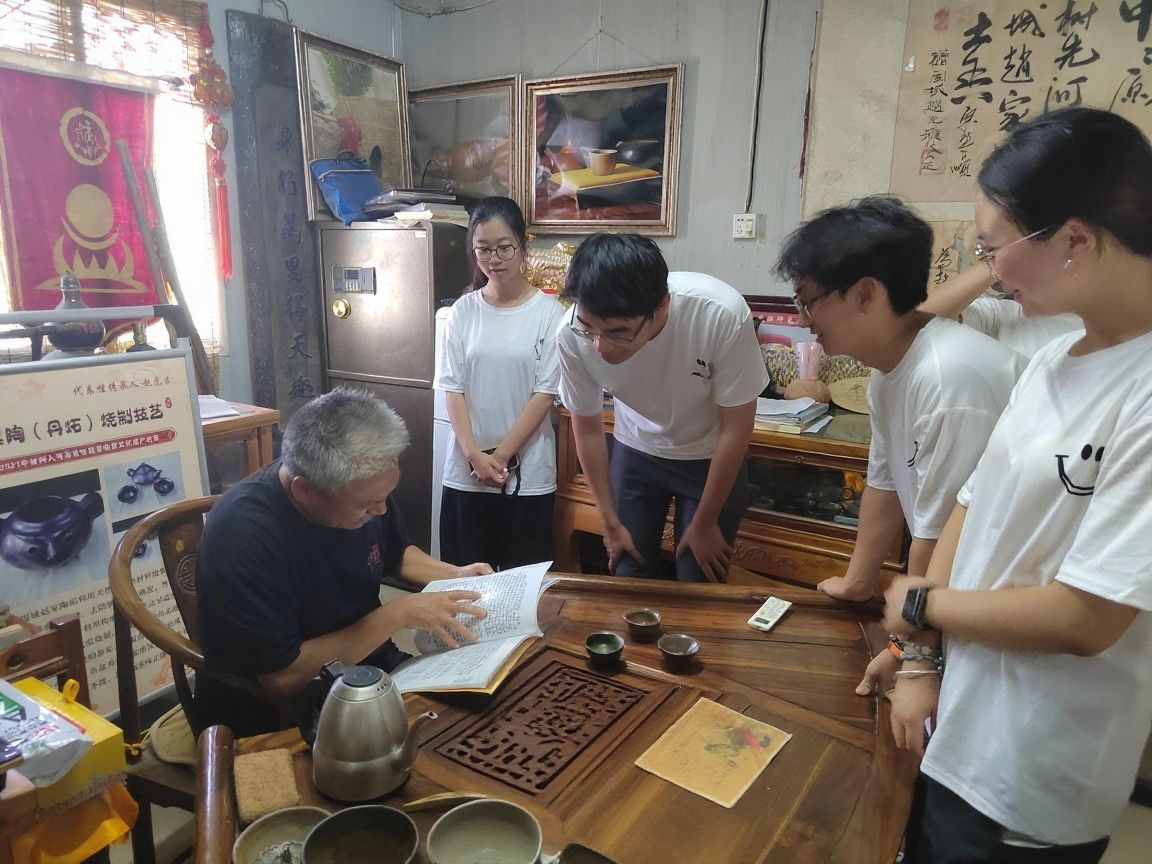 实践团队踏入陶艺工坊,架子上有序陈列着粗陶碗碟、创意摆件,质朴造型传递着传统工艺的温度。队员们近距离观察泥土经拉坯、烧制变为器物的过程,触摸陶艺文化的历史肌理,为后续实践筑牢认知根基。随后,陶艺匠人通过讲述拉坯、彩绘、烧制等环节的制作步骤,让同学们对陶艺文化有了更加全面的了解。队员们围站聆听,从传统图腾寓意到烧制技艺传承,在匠人的故事里,领悟“择一事终一生”的工匠精神,感受传承人对陶艺文化的热忱与坚守。最后,匠人向同学们分享非遗进校园的实践,他们共同探讨拓宽传承的路径,努力让古老技艺适配现代教育,孕育传承新可能,完成了一场从感知文化到思考行动的青春与传统工艺的碰撞。同学们纷纷表示,会将传承与新时代紧密结合,在今后的学习生活中,主动传播陶艺文化,把传统陶艺的魅力融入校园活动,用创意设计赋予古老陶艺新形式,让更多人看见传统工艺的价值。