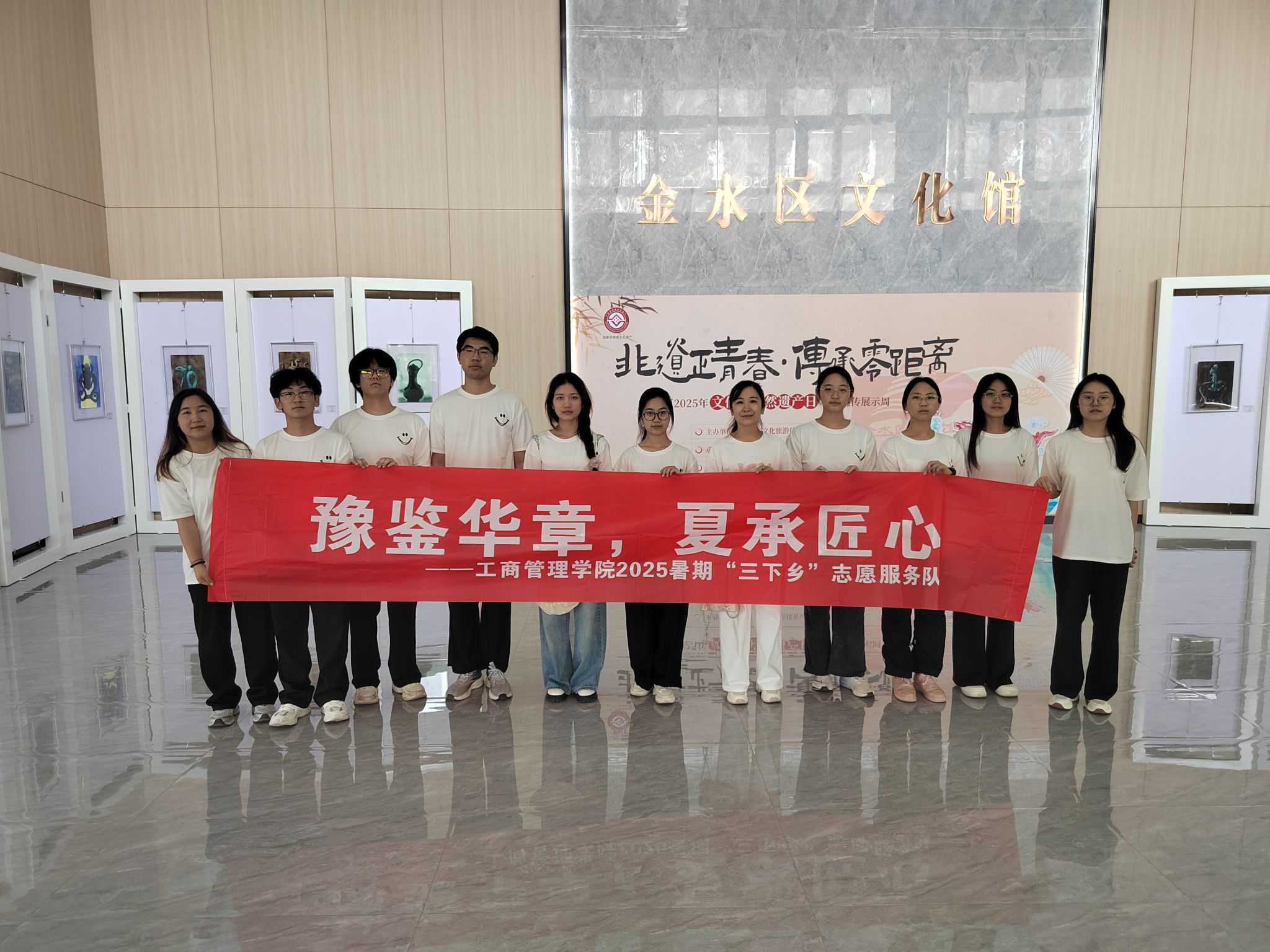 踏入展馆,浓厚的艺术氛围扑面而来。队员们跟随着讲解员的指引,穿梭于不同展区,在色彩碰撞中了解厚重的历史文化故事。参观途中,队员们自发组成讨论小组,围绕作品的文化内涵、创作手法进行交流。在一幅人物主题画作前,大家聚焦画面细节,探讨艺术如何传递情感与时代印记,从色彩运用到构图设计,从文化符号解读到创作意图揣摩,思维的火花不断迸发。负责讲解的队员结合提前查阅的资料,为伙伴们补充作品背后的文化故事,让参观不止于“看”,更深入“悟”。除了静态展品,社会实践团队也积极体验剪纸创作,在折、剪、刻的过程中,体会传统工艺的精巧与不易。活动尾声,实践服务队在“大河考古博物馆”标识前整齐列队、合影留念。