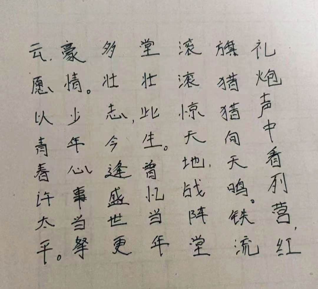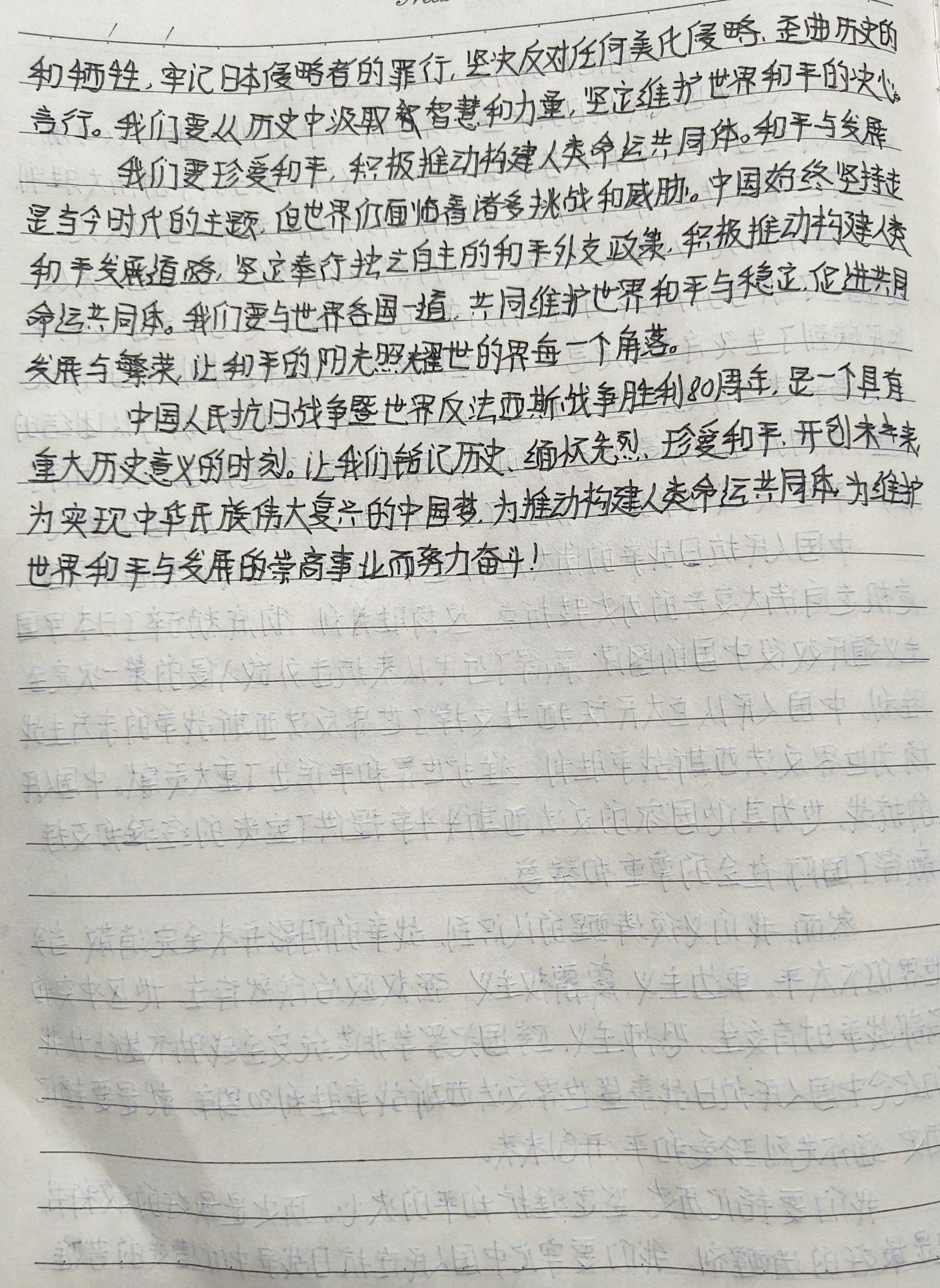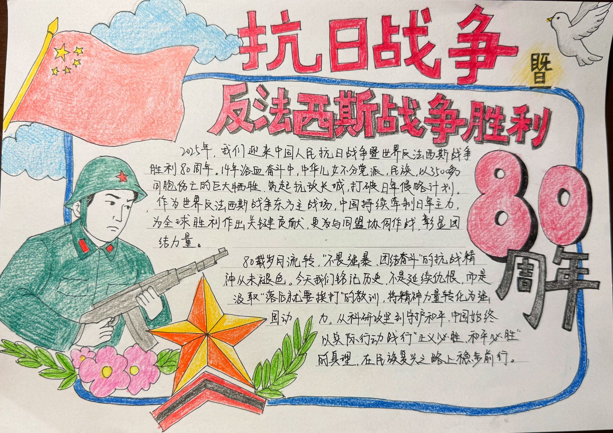 活动期间,同学们热情高涨、积极参与,将阅兵式上的庄严军容、先进装备、老兵风采等深刻记忆与自身的校园学习生活、青春理想追求相融合,通过诗歌、文章、手抄报等形式展开创作。在诗歌创作环节,同学们描绘“铁甲洪流奔向前,山河无恙续新篇”的壮阔图景,书写“八秩春秋铭国耻,今朝我辈振山河”的壮志豪情,字里行间满含对祖国强大的自豪与对使命担当的认知。在文章创作中,同学们结合校园里的理论学习、志愿服务、科创实践等经历,分享从阅兵精神中感悟到的“奋斗”“自强”真谛。手抄报创作则成为视觉化的“爱国宣言”,同学们巧妙融合阅兵元素与校园场景,用鲜艳的色彩勾勒受阅方阵,用工整的字迹摘录抗战历史与理想誓言,将红色记忆与青春色彩生动呈现。这些优秀的作品,缅怀着革命先烈为民族独立和世界和平抛头颅、洒热血的英勇事迹,承载着当代青年铭记历史、缅怀先烈、珍爱和平、开创未来的决心。