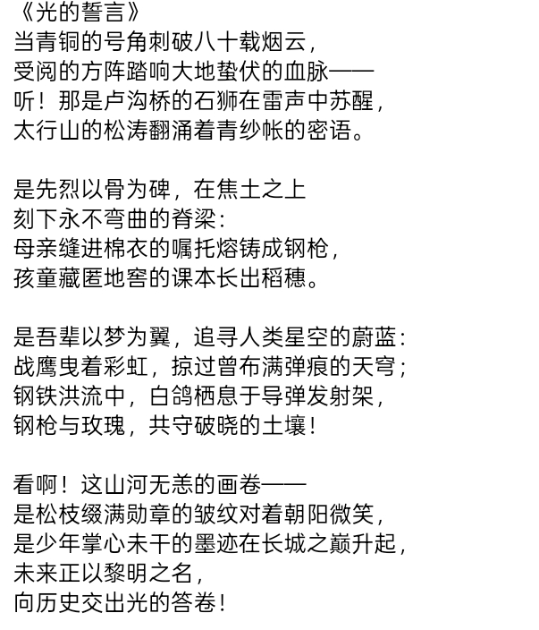 为铭记历史功勋,传承伟大抗战精神,引导青年学子从“九三阅兵”的震撼场景中汲取奋进力量,将爱国情怀与个人理想、校园生活紧密结合,ok138cn太阳集团古天乐于9月3日至5日开展“九三阅兵”主题创作活动,号召全体同学以笔为媒,抒发对历史的敬畏、对未来的期许。