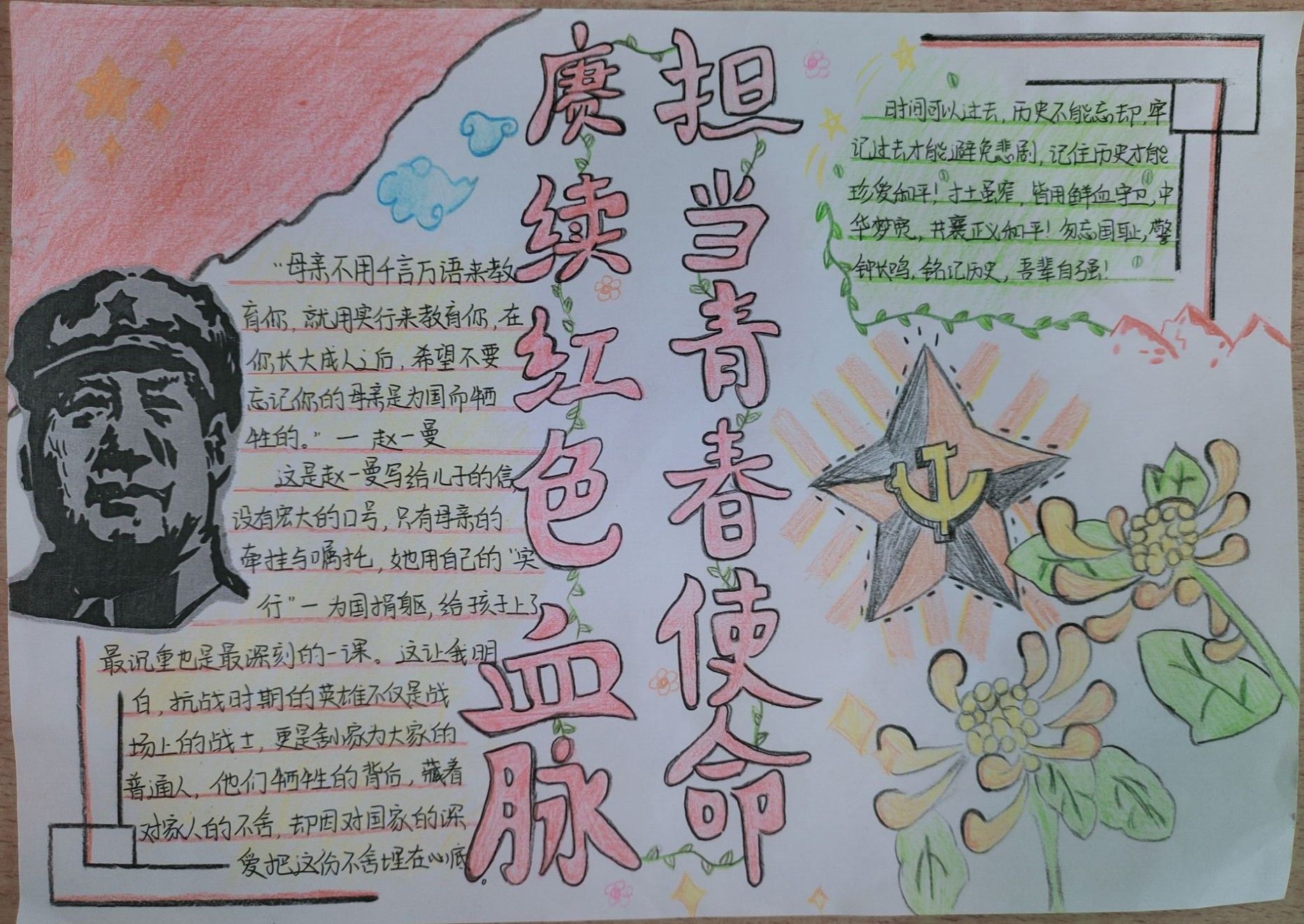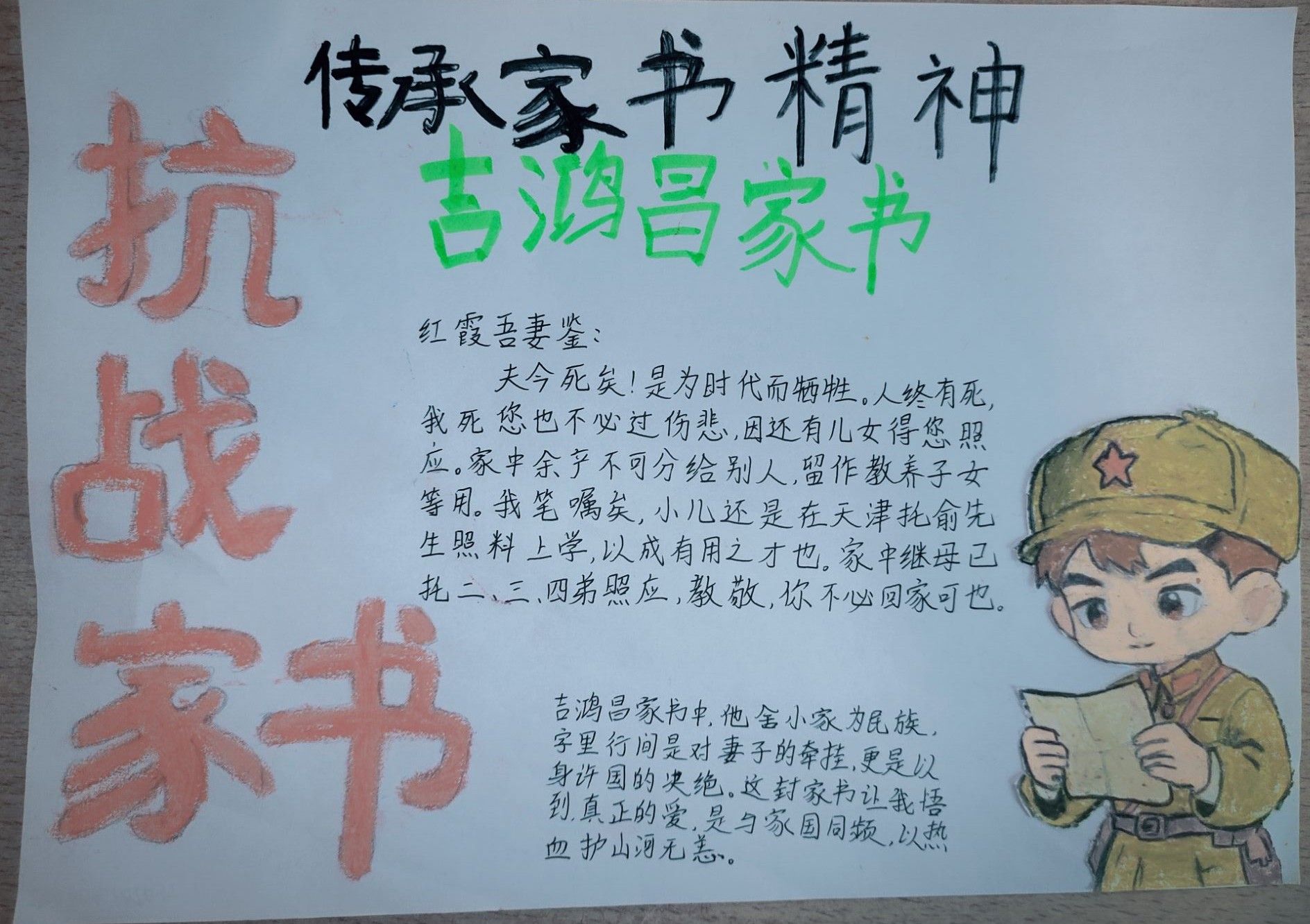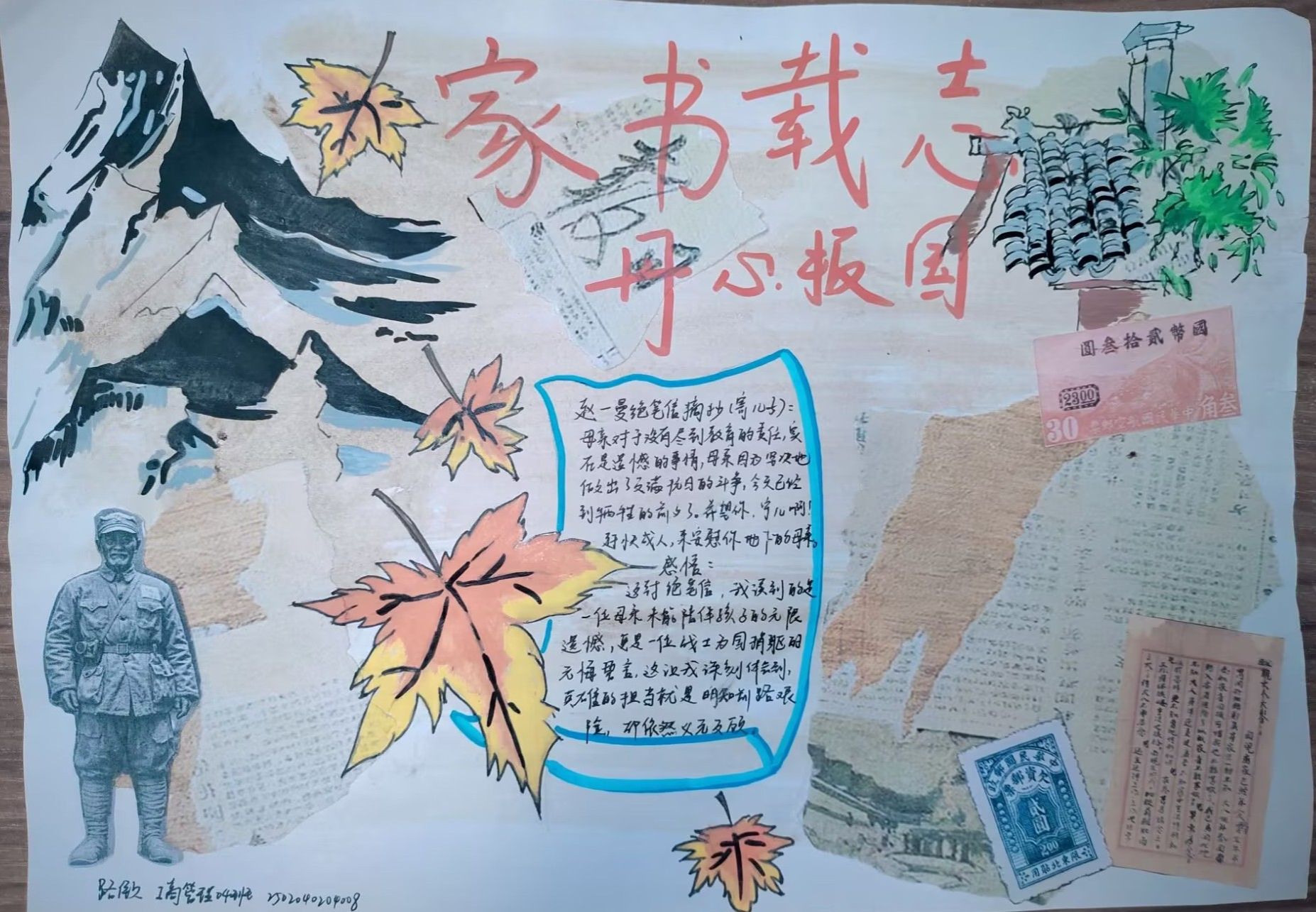 活动一经展开,同学们便积极响应。在明信片创作环节,同学们化身历史传承者,从抗战家书中精心摘抄经典语句并附上个人感悟。这些文字虽褪去华丽辞藻,却字字铿锵地将个人生死、家庭思念与民族存亡紧密交织,尽显烽火岁月里的家国情怀。而A4纸创作环节,则成为同学们挥洒创意的舞台。大家通过绘画、拼贴等多元方式,将家书背后的故事具象化呈现:有的巧妙融入旧报纸碎片等年代感素材,模糊的字迹仿佛打开时光闸门,将人带回战火纷飞的往昔;有的以细腻笔触勾勒英雄形象,坚毅的面容、挺拔的身姿跃然纸上。这些作品不仅让抽象的抗战记忆变得鲜活可感,更让英雄精神在笔墨与创意间重新焕发生机。