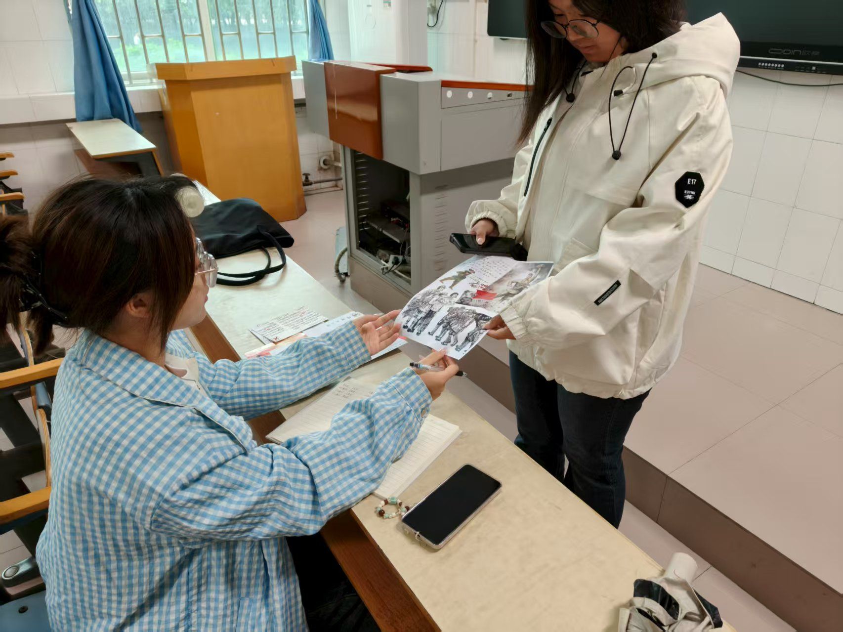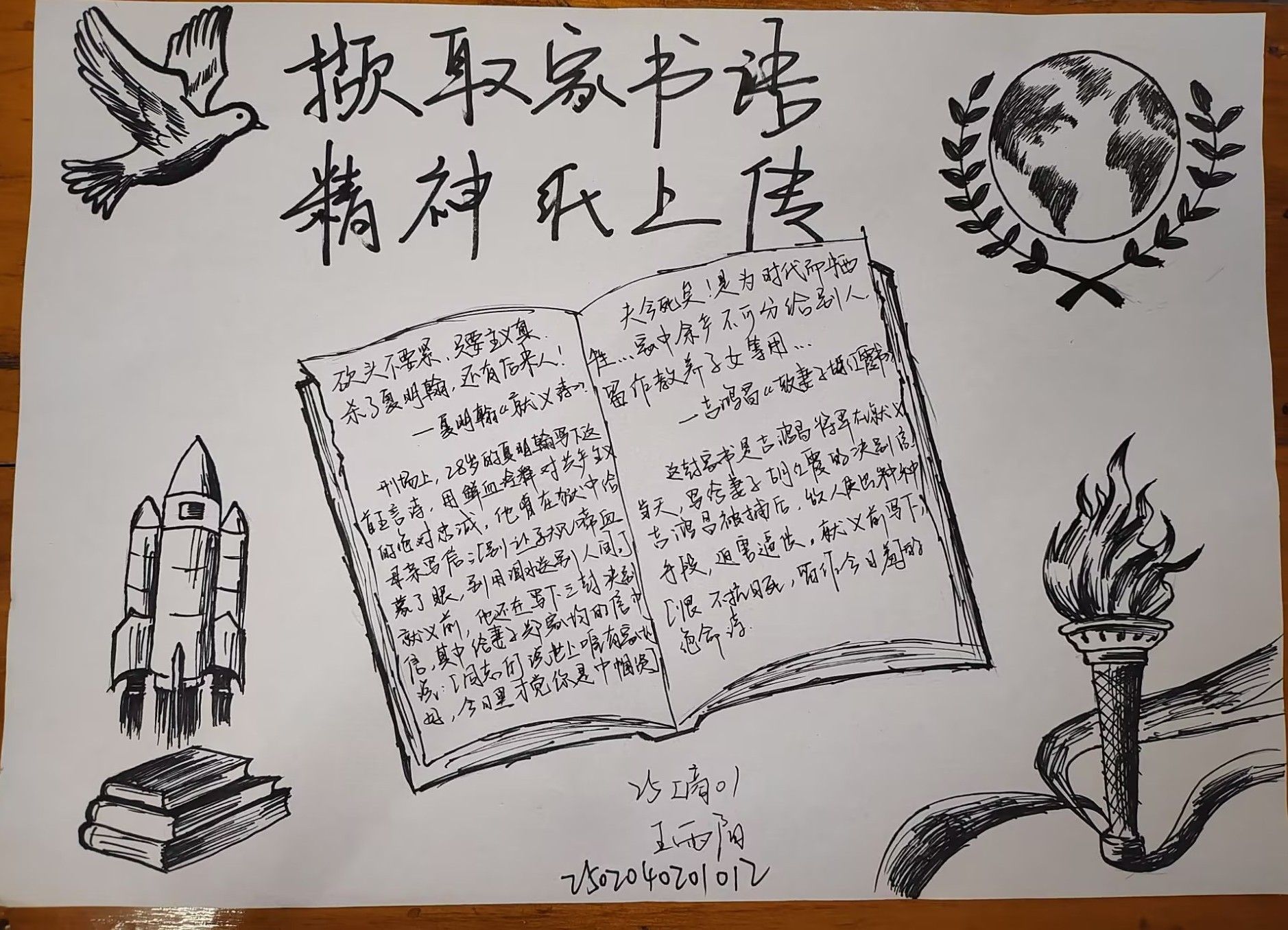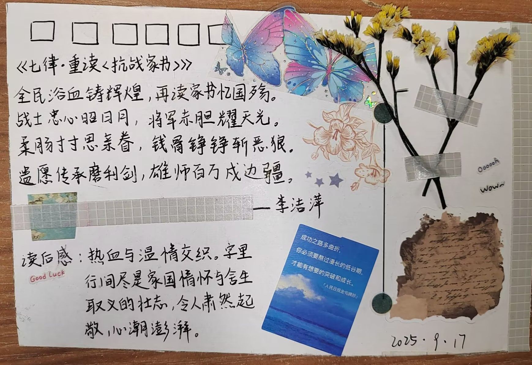 活动一经展开,同学们便积极响应。在明信片创作环节,同学们化身历史传承者,从抗战家书中精心摘抄经典语句并附上个人感悟。这些文字虽褪去华丽辞藻,却字字铿锵地将个人生死、家庭思念与民族存亡紧密交织,尽显烽火岁月里的家国情怀。而A4纸创作环节,则成为同学们挥洒创意的舞台。大家通过绘画、拼贴等多元方式,将家书背后的故事具象化呈现:有的巧妙融入旧报纸碎片等年代感素材,模糊的字迹仿佛打开时光闸门,将人带回战火纷飞的往昔;有的以细腻笔触勾勒英雄形象,坚毅的面容、挺拔的身姿跃然纸上。这些作品不仅让抽象的抗战记忆变得鲜活可感,更让英雄精神在笔墨与创意间重新焕发生机。