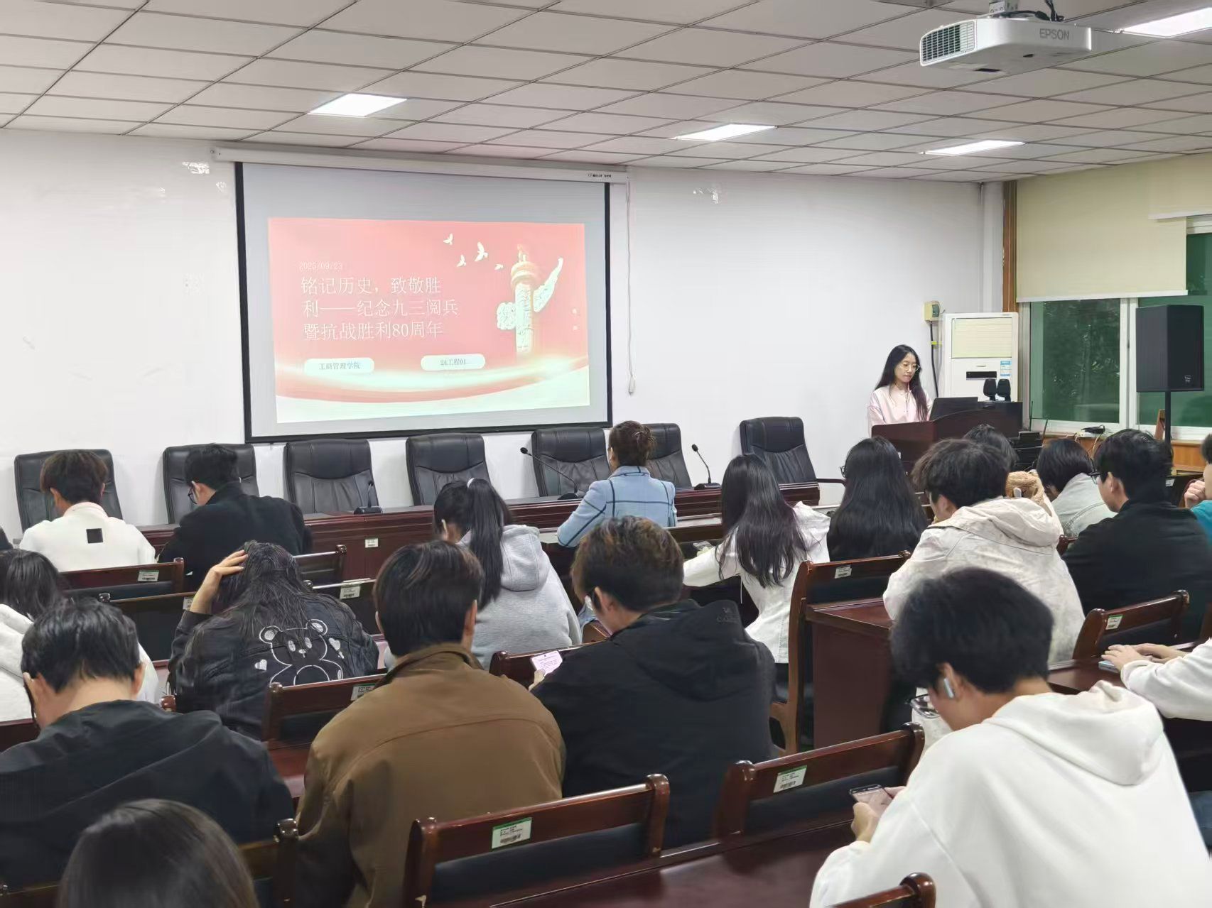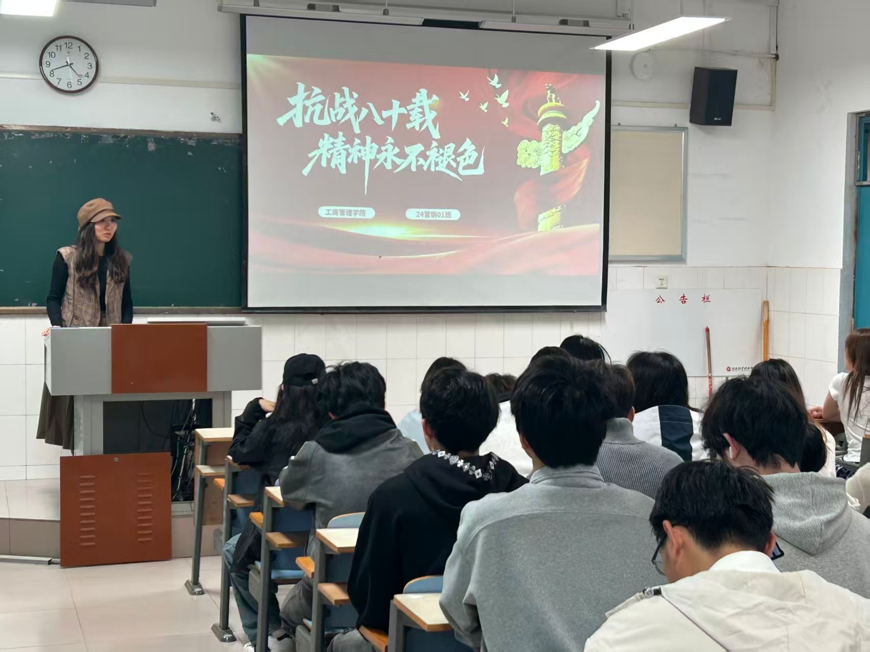 活动期间,各班级辅导员老师、学委和班长围绕“九三阅兵与抗战胜利80周年”这一核心主题,从九三阅兵的盛大场景切入,逐步追溯到抗战时期感人的英雄事迹;既历史事件进行深度剖析,又结合当下衣食无忧的生活对比阐释和平的来之不易,为同学们呈现了一场场精彩纷呈的班会。同时,各班级辅导员老师全程深度参与,不仅在班会过程中针对内容逻辑、情感传递给予专业指导和精准点评,还以平等交流的姿态与同学们共同回顾历史细节、分享自身感悟,在思想的碰撞中进一步拉近了师生之间的距离。另外,同学们以小组为单位,从“抗战精神的时代价值”“青年如何传承红色基因”等不同角度深入探讨抗战精神,现场积极发言、热烈讨论,纷纷表示将铭记历史、勇担使命,把对英雄的崇敬转化为努力学习、报效祖国的实际行动。