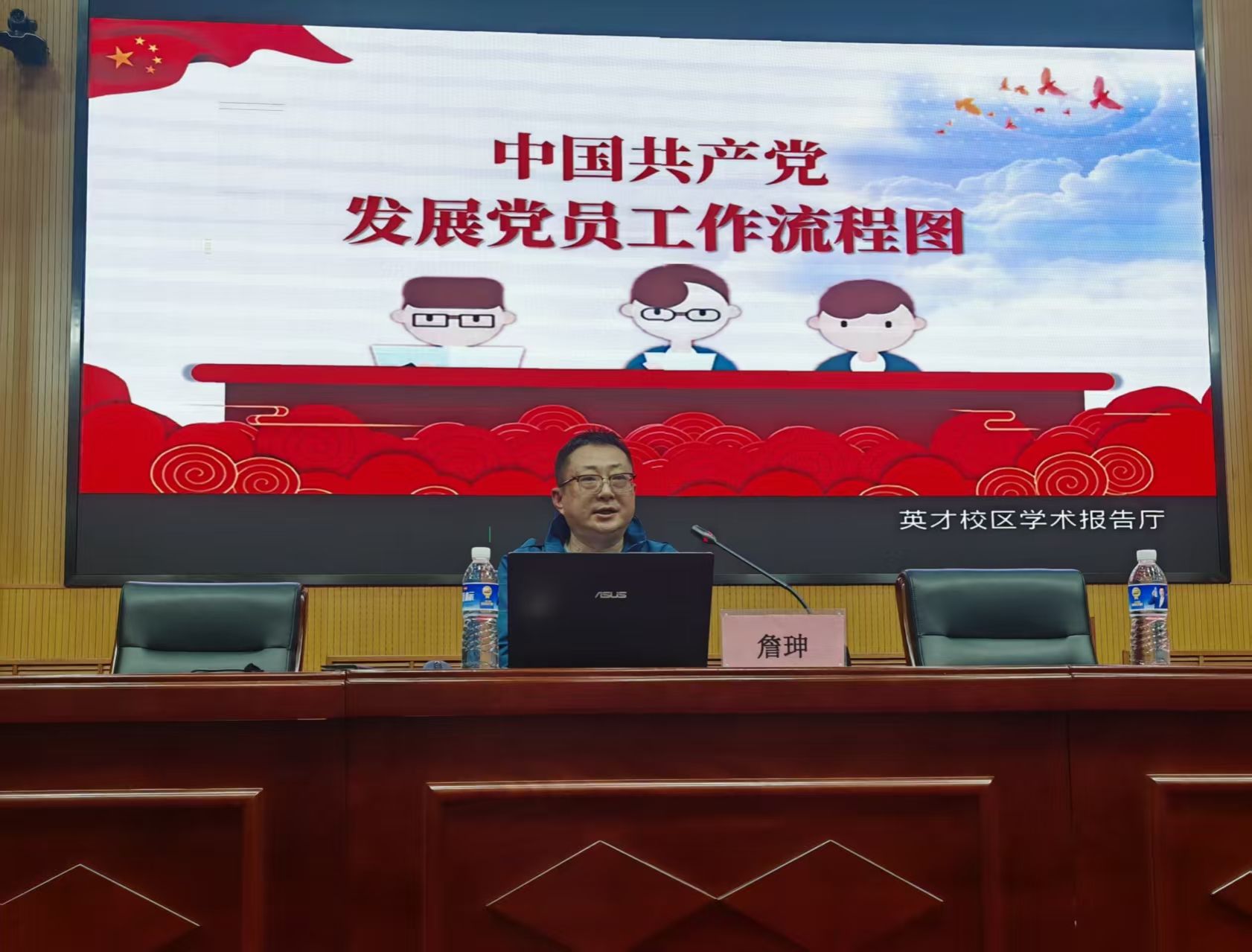 讲座伊始,学院党委副书记詹珅聚焦“为何入党”这一核心问题展开论述,强调入党动机的纯粹性是迈向党组织的“第一道门槛”。他结合高校党建工作实际与青年成长案例,指出新时代大学生入党应基于对党的深刻认同与对使命的主动担当,在思想根源上树立“为人民服务”的信念。接着,他又围绕“如何入党”系统拆解流程要点,不仅列出入党流程的完整链条,更针对新生易混淆的“积极分子考察期标准”“发展对象政治审查要求”等关键节点进行重点解读。最后,詹珅以“一次入党申请,一生信仰坚守”作结。他鼓励新生以身边优秀党员为榜样,将政治追求融入日常学习与社会实践,在锤炼专业本领的同时筑牢思想根基。新生纷纷表示已对入党流程与初心使命有了更深刻的理解,未来将以实际行动争取早日成为党组织的一员,为民族复兴事业添砖加瓦。