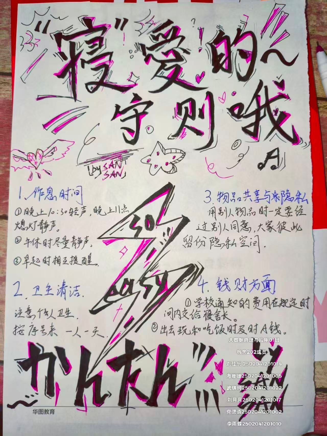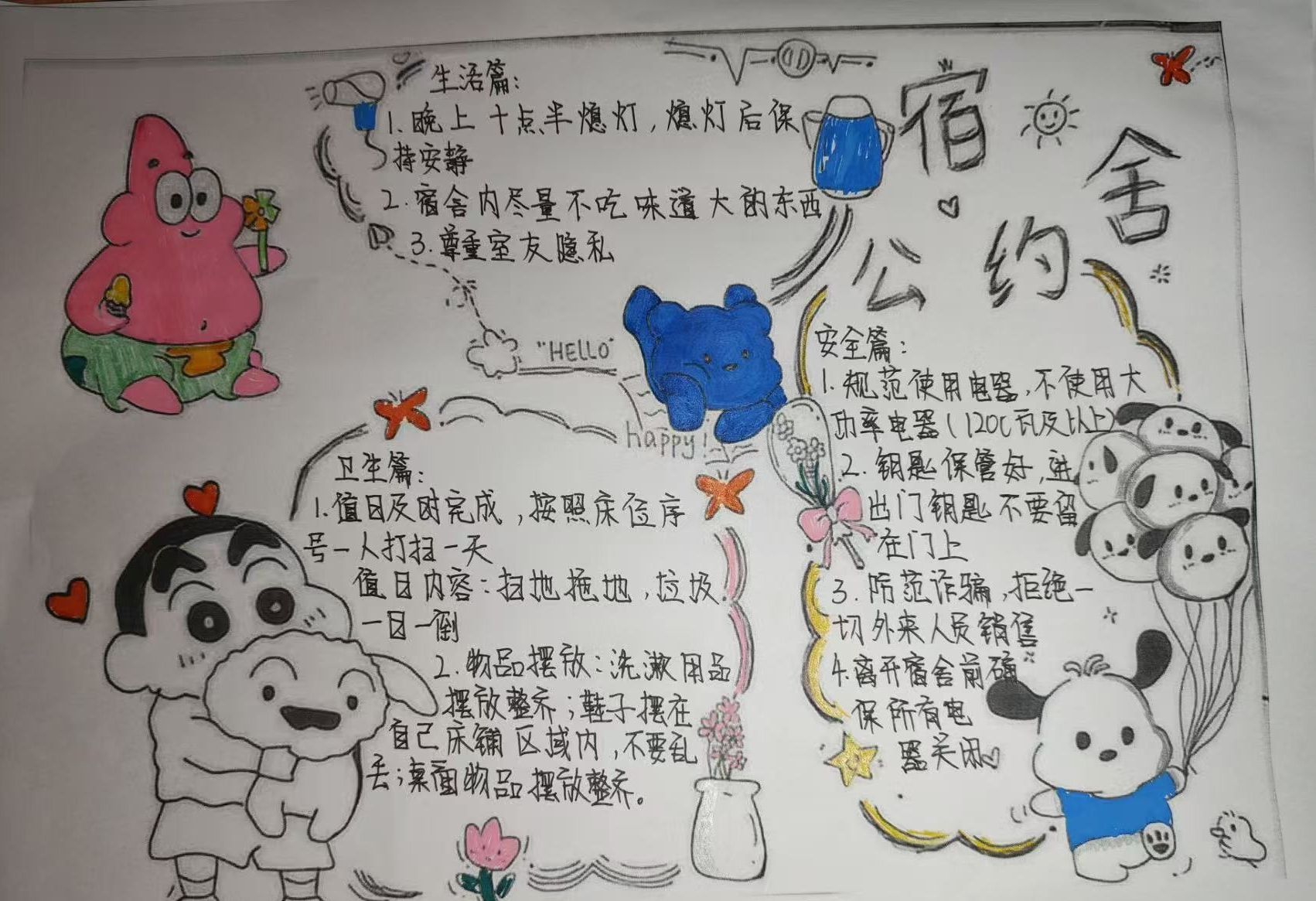本次活动旨在通过宿舍成员共同商讨、制定适合本宿舍的行为规范,明确作息时间、卫生值日、物品摆放及公共物品使用等方面的要求,进一步增进室友之间的沟通与理解,促进彼此包容,化解潜在矛盾,营造融洽和睦的生活氛围。活动期间,各宿舍成员踊跃参与,积极发表意见,共同拟定具有宿舍特色、务实可行的文明公约。许多宿舍不仅制定了文字公约,还配套设计了值日表、公约签名墙等,增强了执行的仪式感和约束力。这一过程不仅深化了同学们对集体生活的认同,也锻炼了沟通协调与团队合作能力。