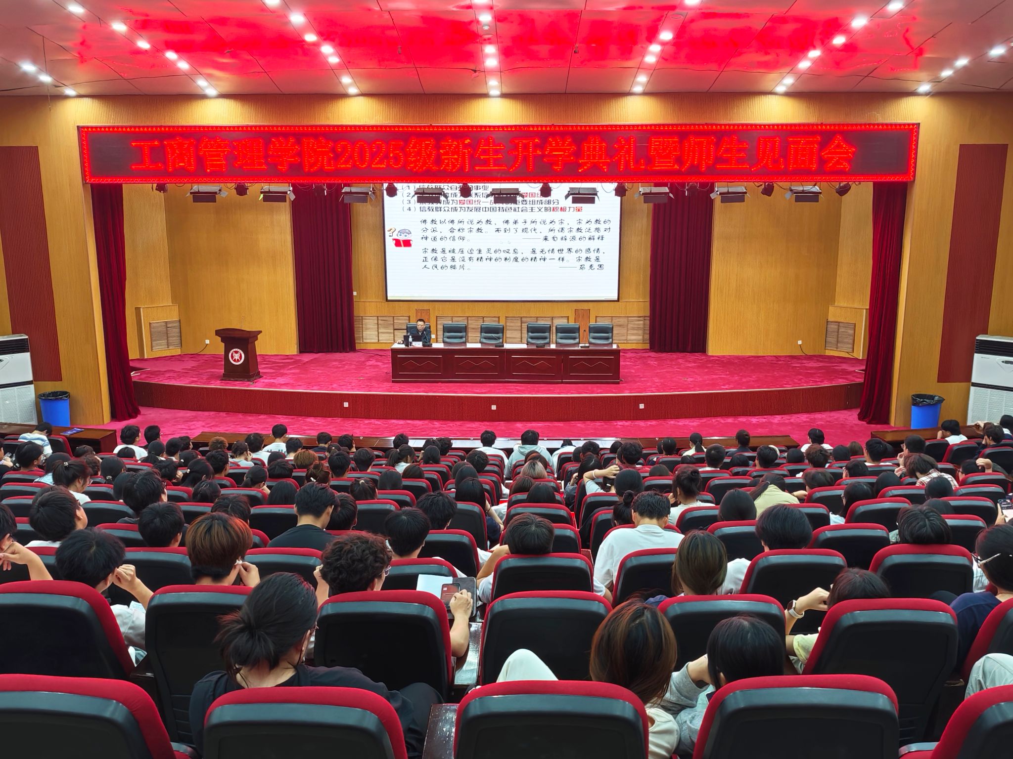 讲座中,学院党委副书记詹珅以民族宗教政策核心内涵及法律法规为切入点,梳理我国民族宗教政策发展历程与基本原则,解读《中华人民共和国民族区域自治法》《宗教事务条例》等关键条款,帮助新生建立整体认知框架。接着,詹书记结合典型案例,分析我国在保障民族平等、促进民族交融、规范宗教管理等方面的成果,同时对校园中可能出现的不当宗教宣传、民族文化误解等问题进行风险提示与引导,重点强调新时代青年更应树立正确民族观、宗教观,抵制错误思想,尊重民族习俗。最后,詹珅希望新生进一步深化政策学习,将知识转化为行动,争当民族团结促进者、宗教政策宣传员,为和谐校园与国家民族事业发展贡献青春力量。