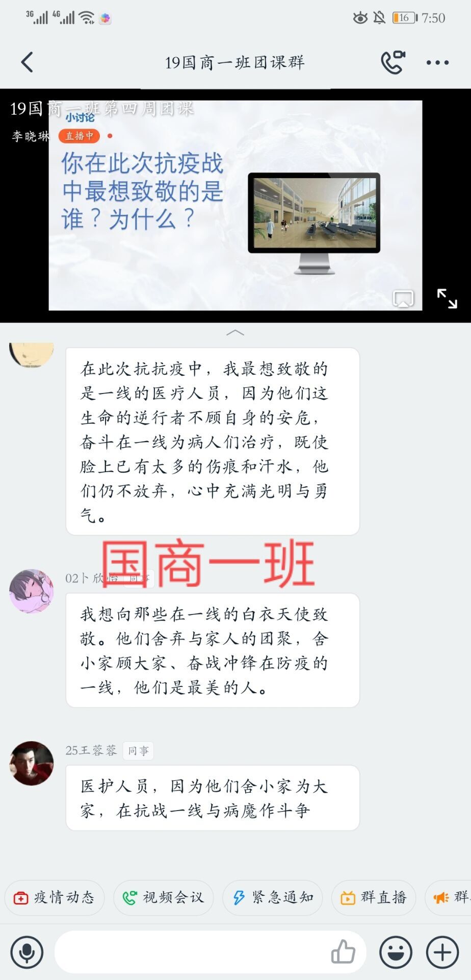 团课伊始,各班团支书组织本班同学进入钉钉软件开展线上团课,并带领同学们就郑邦山厅长提出的“社会即课堂,生活即教育”观点进行讨论。随后,主持人带领大家共同了解钟南山、李兰娟及摆渡快递小哥、90后医务工作者等奋战在防疫一线的工作人员的感人事迹,并抽选同学对抗击疫情中所展现的奉献精神和大爱精神发表感悟。最后,各班团支书对本次团课进行总结,号召同学们主动参与到抗疫工作中,积极学习身边优秀抗疫事迹,传递正能量,致敬一线抗击疫情的英雄们,坚定战疫必胜信念!