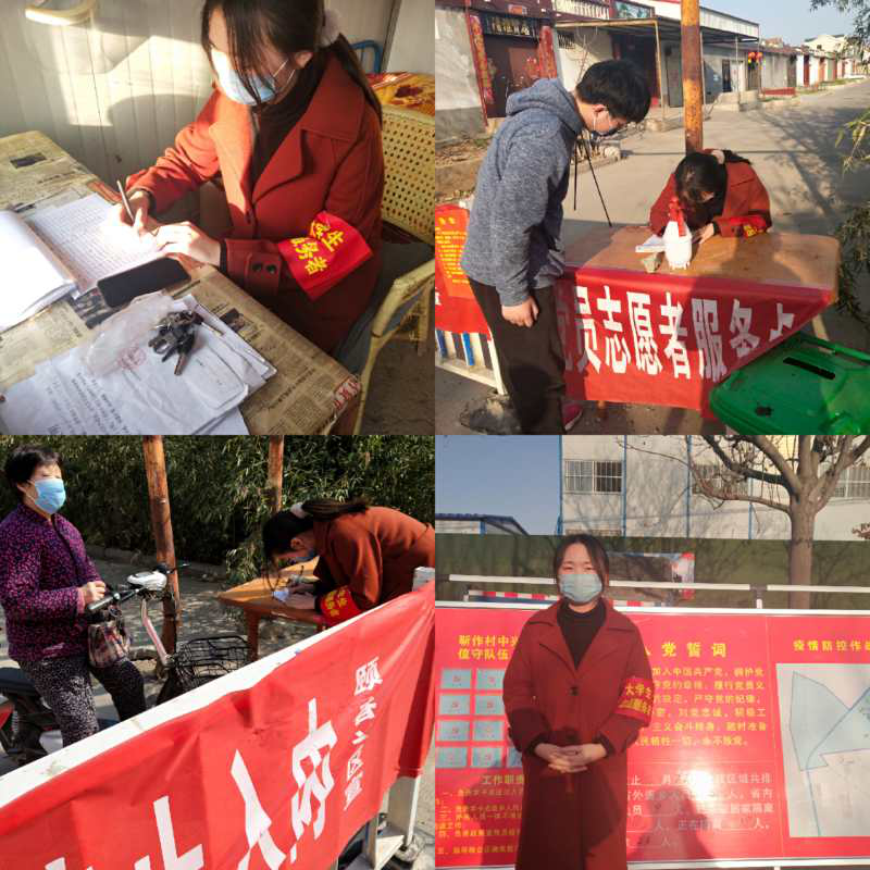 2020年2月15日,17级国际商务二班的李晓楠向家乡平顶山市鲁山县鲁阳街道办事处申请成为了一名抗疫志愿者,她参与到了社区防疫工作中,每天对社区进出人员进行来往登记,测量体温,并记录信息。疫情面前,她主动担当,为抗疫战斗注入青春的力量,用自身的行动表达对抗疫的决心与信念。