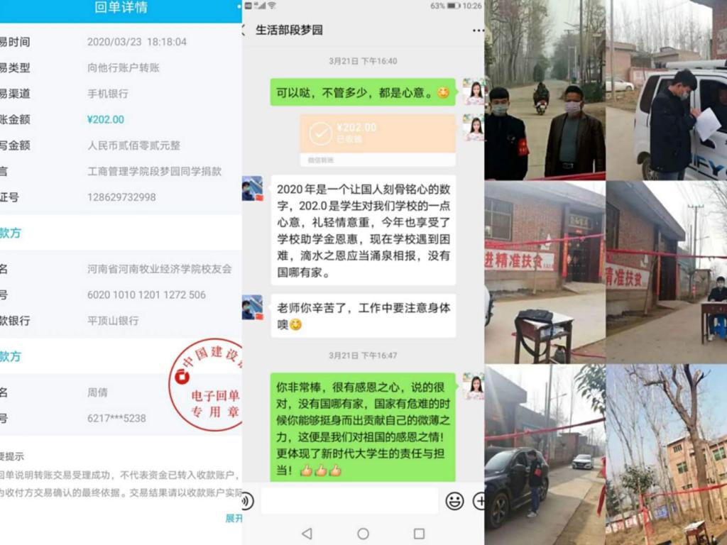 和衷共济,助力母校。3月12日,我院毕业生校友梁旖旋、李晨璐、周红仙和在校生校友刘俊敏、袁宇慧等22名同学,在得知校内防疫物资短缺后,主动请求向学校捐款,在校学子与毕业学子心系母校齐合力,一个个充满爱心与担当的红包纷纷涌入了学校爱心捐款的账号,共计1036元。“众人拾柴火焰高,相信每人都出一份力,我们一定能够打赢这场疫情防疫狙击战。”捐款学子如是说。病毒无情,人间有情,爱心捐款捐赠的不仅仅是金钱,更是我院学子们奉献母校的责任与担当!