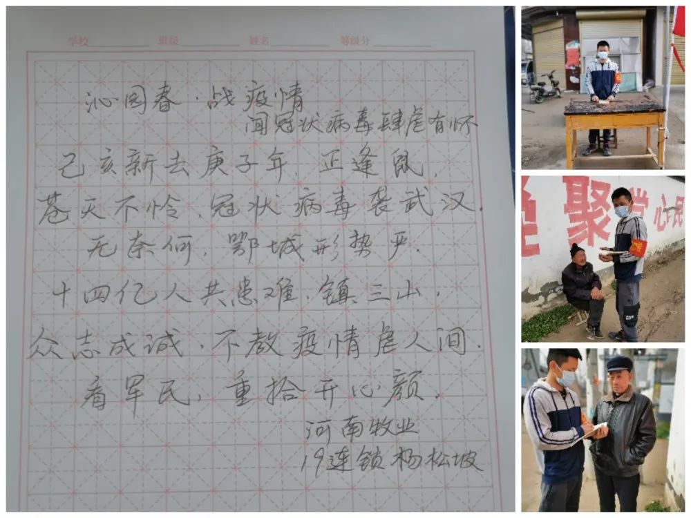 勇于担当,不负韶华。19级连锁与经营管理01班的杨松坡,从3月1日至今,利用其课余的闲暇时间在其家乡所在地河南省商丘市柘城县慈圣镇韩相鲁村,参与疫情防控的值班工作,并走访排查村内空巢老人的生活状态及心理情况,为他们解决遇到的问题,向社会贡献新时代的青春力量。