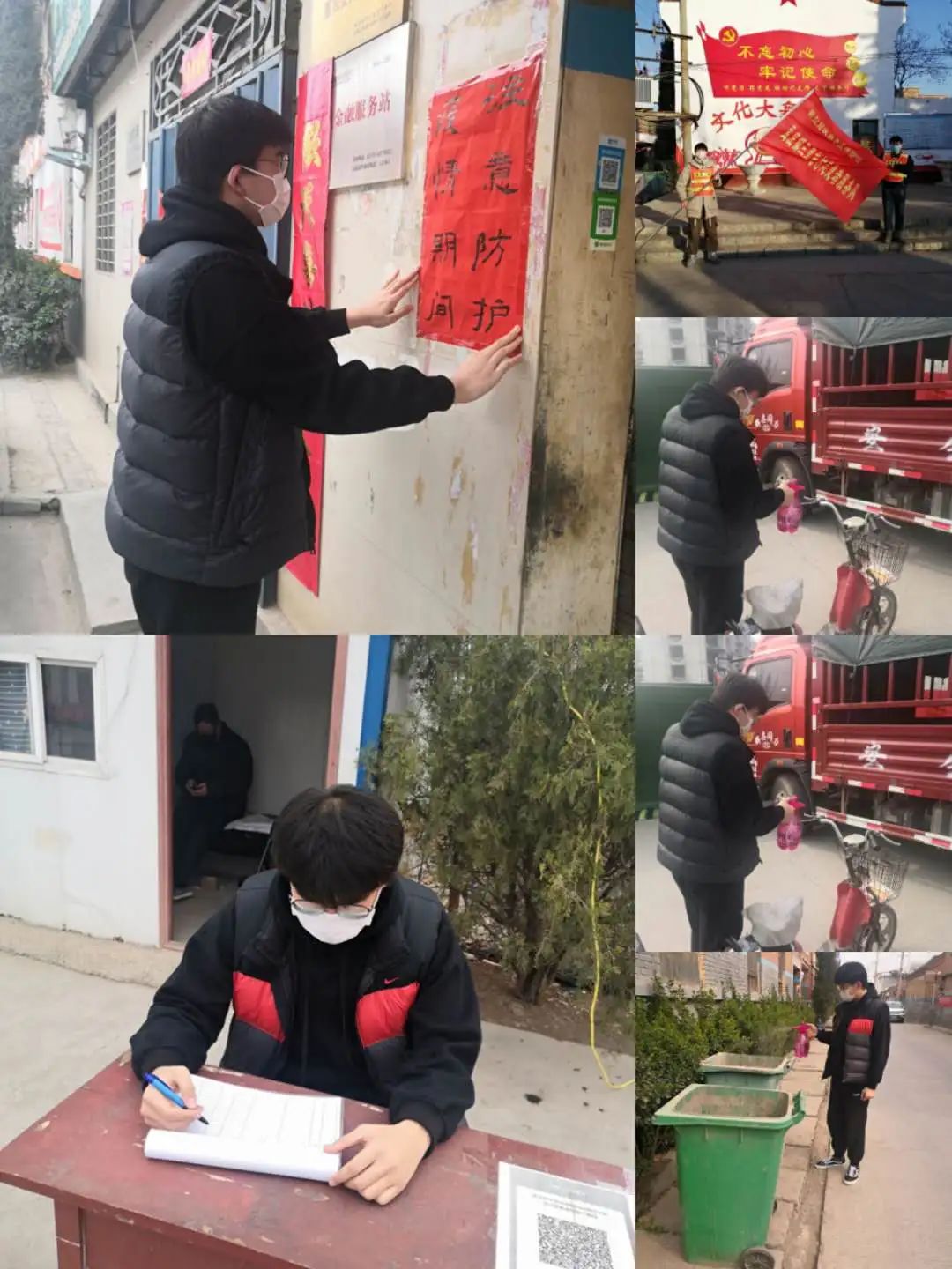 青春力量,抗疫有我。2月4日至今,19级国际商务2班的冯培轩在家乡河南省新乡市辉县市孟庄镇三里屯村担任志愿者。他每天按时在村庄进出口处值班,为出入人员测量体温,登记进出人员的具体信息,拦截进出车辆,对附近共享单车及垃圾桶进行消毒,并张贴防疫宣传报。疫情不除,志愿不止,他默默付出,用自己的实际行动诠释新时代大学生的奉献和担当。