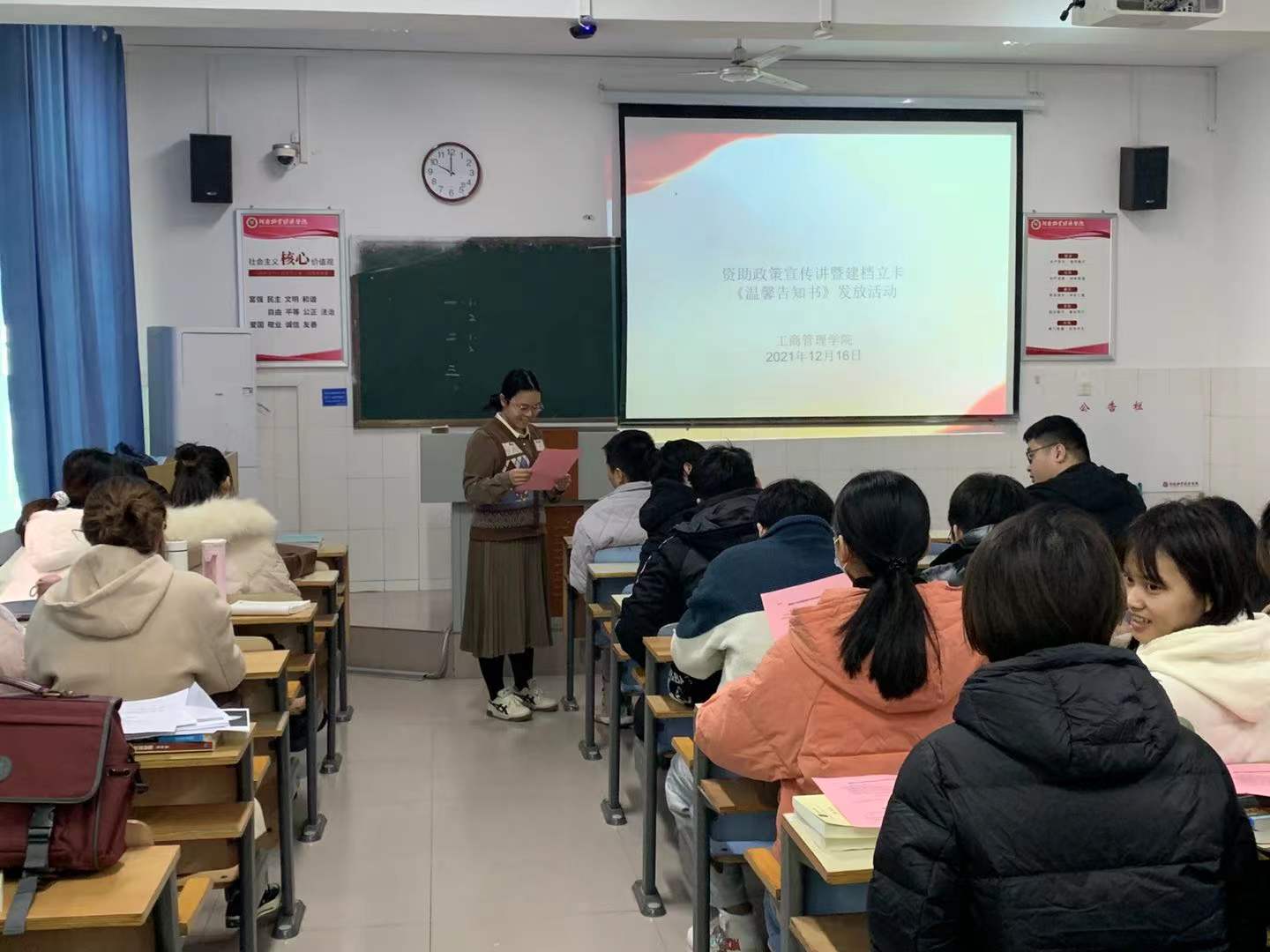 为落实建档立卡家庭学生资助政策,确保我校建档立卡贫困家庭学生及家长知悉2021年秋季受助情况,我院资助相关的工作有序推进,ok138cn太阳集团古天乐于12月16日在B304开展资助政策宣讲并发放《建档立卡贫困家庭学生受助情况温馨告知书》。
