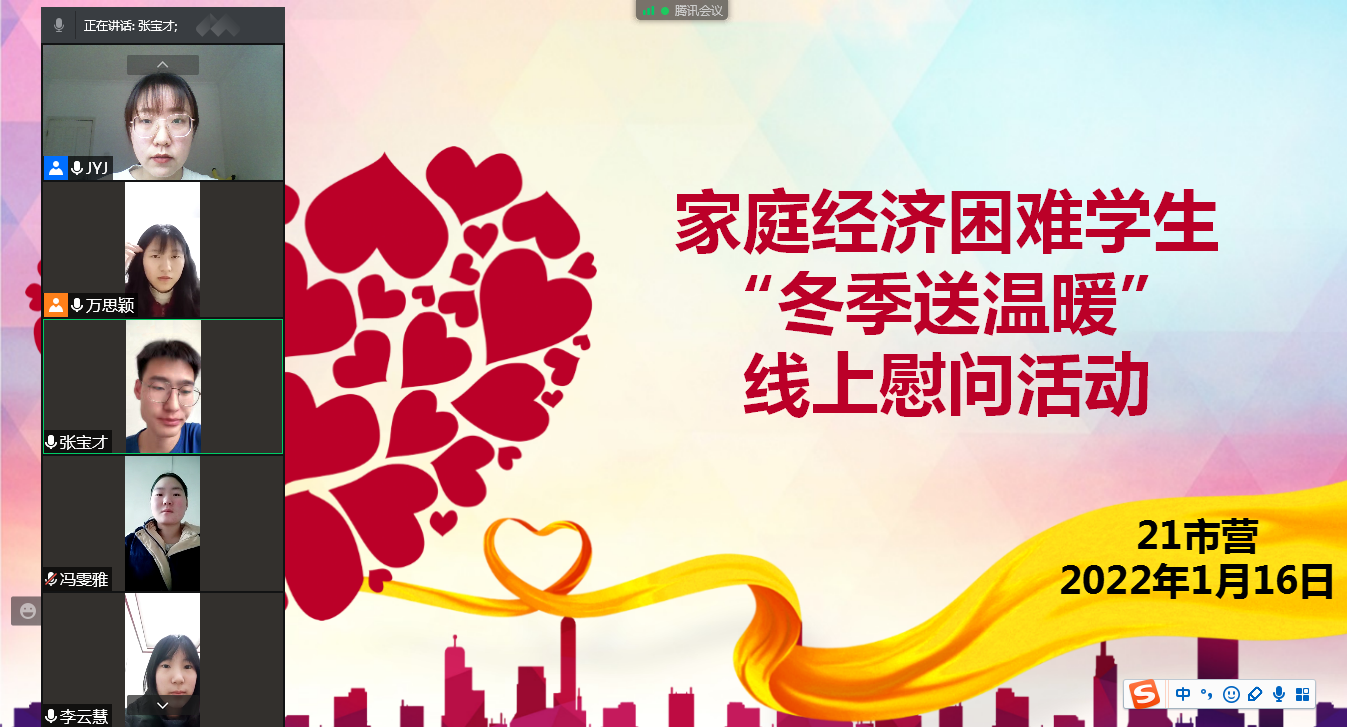 由于疫情原因,各位辅导员老师无法实现线下走访,但仍然积极进行线上慰问和走访。一是通过腾讯会议形式与建档立卡学生进行线上座谈,共线上座谈90逾人。了解建档立卡学生的家庭经济现状和最新受助需求;向建档立卡家庭宣讲国家及我校现行的资助政策;告知学生家庭主要成员该生在2021年秋季学期受资助情况,同时核查《建档立卡贫困家庭学生温馨告知书》的发放与张贴情况;并通过线上家访询问学生所处地区的疫情情况,提醒学生做好自我防护。二是对于部分家庭经济特别困难学生,辅导员老师与他们进行一对一的针对性线上家访,共针对性家访23人。各位辅导员咨询学生生活、学习上的困难与诉求,激励学生自立自强,用行动为社会做贡献,同时通过网购形式为他们送去米、面、油等生活用品以及笔、本等学习用品。