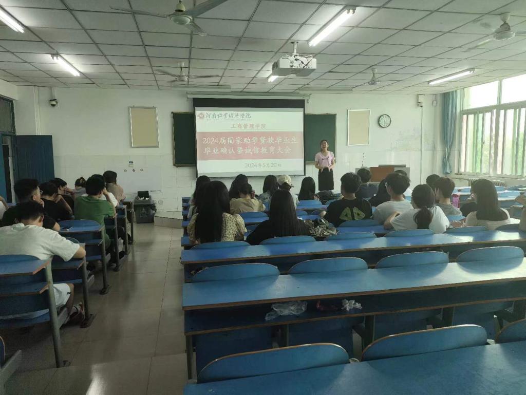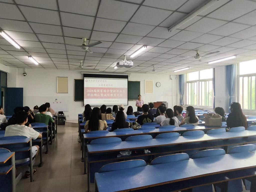 为进一步做好我院国家助学贷款的贷后管理工作,全面贯彻国家资助保障体系、加强贷款毕业生的诚信意识。根据我校《关于做好2024届国家助学贷款毕业生毕业确认工作的通知》的要求,ok138cn太阳集团古天乐于5月20日在E402召开2024届国家助学贷款毕业生毕业确认暨诚信教育大会,学院2024届高校助学贷款和部分生源地助学贷款毕业生参加,会议由我院资助专员席亚芳老师主持。